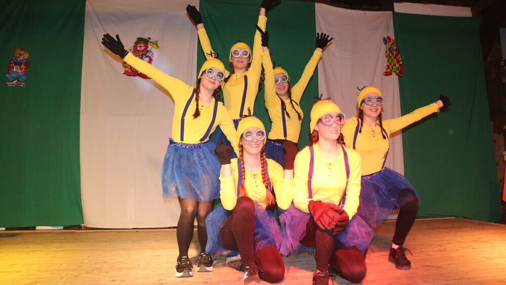 | Bei der Generalprobe machten die Brillen noch Probleme, bei den Auftritten läuft’s rund: Die Minions Anna, Leona, Frieda, Emma, Smilla und Finja unter der Leitung von Kerstin Westhoff. |
