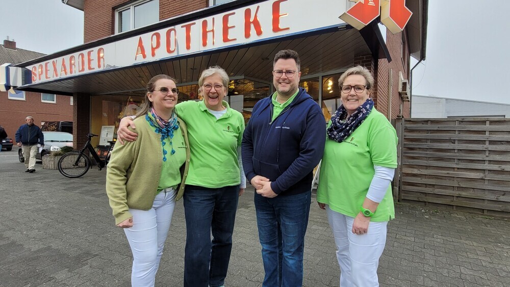 | In Spexard kennt man sie: Sandra Wittkop (v.l.), Antje Baumeister, Matthias Irrgang und Annette Lux versorgen die Bürger mit Arznei. Bei Annette Lux ist das schon seit 43 Jahren der Fall. |