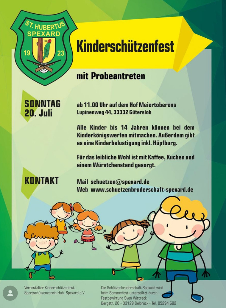 Mit der Veranstaltung starten die Hubertusschützen in die Festwoche. Auf dem Hof Meiertoberens wurde das Marschieren geübt und sich auf das Sommerfest eingestimmt. Der neue Kinderkönig entstammt einer echten Schützenfamilie. Mutter Anne war vor 25 Jahren Jungschützenkönigin und Vater Mario ist aktiver Fahnenoffizier der Bruderschaft. Kötters Großeltern Werner und Anni Stüker regierten vor 15 Jahren als Königspaar von St. Hubertus. Das amtierende Königspaar Dirk und Astrid Fortenbacher stifteten einen Wanderpokal für den amtierenden Kinderkönig, der erstmals an Henry Kötter vergeben wurde.