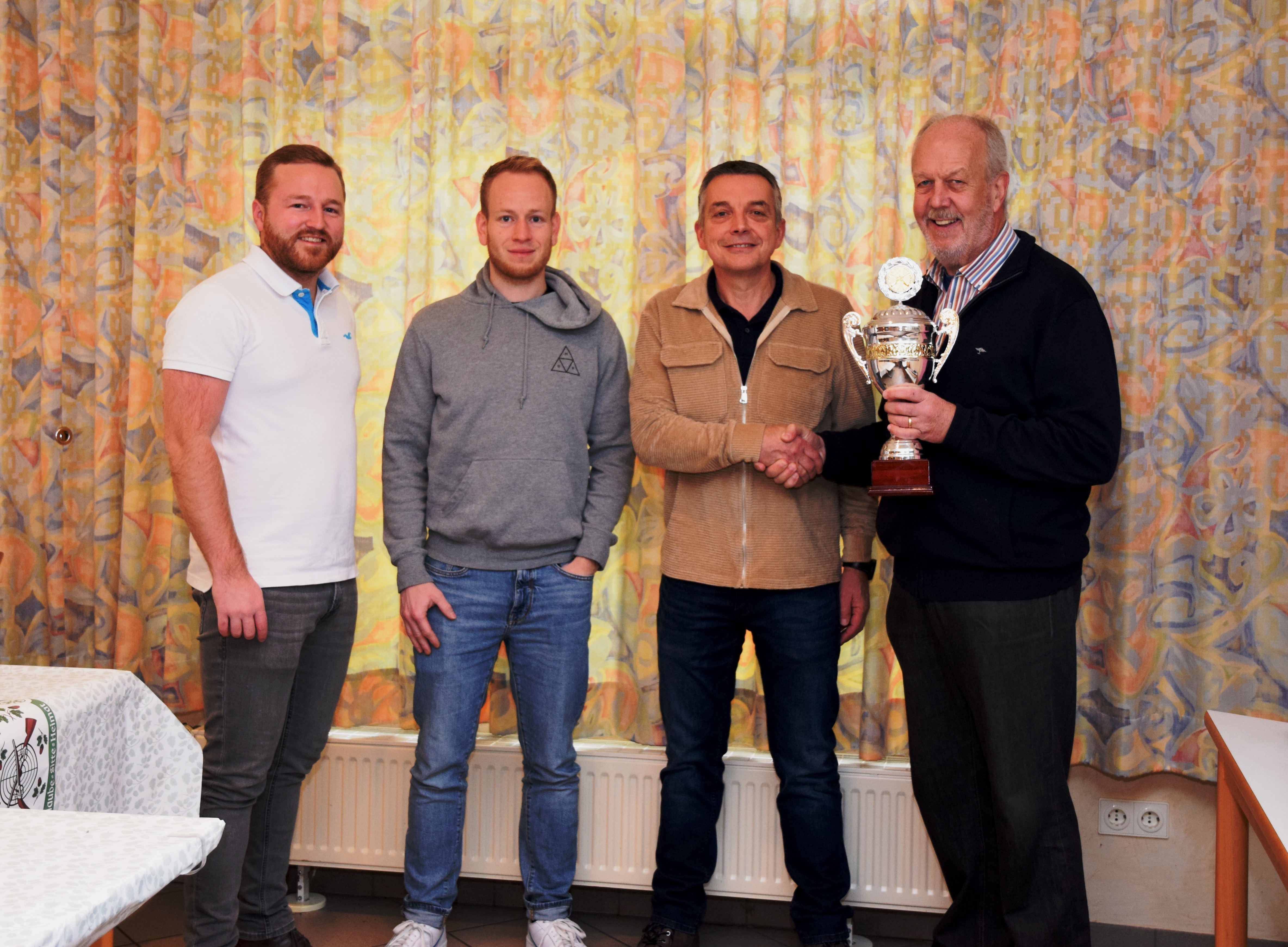 Die siegreiche Mannschaft vom SV Spexard mit Alexander Nolting (v.l), Marvin Bellmann, Voker Stickling und Pokalstifter Alfons Hollenhorst.