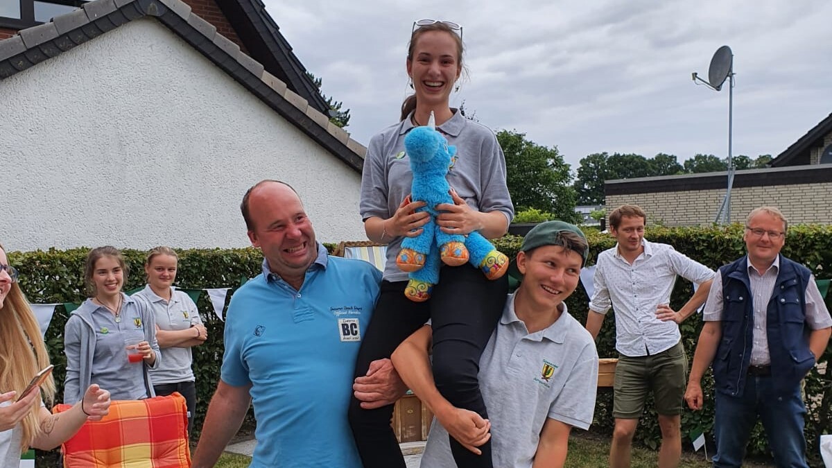 | Auf den Schultern von Jörg Stükerjürgen (links) und Tim Eickhoff wurde die Online-Königin Aileen Kahlert in einem privaten Garten gefeiert. |