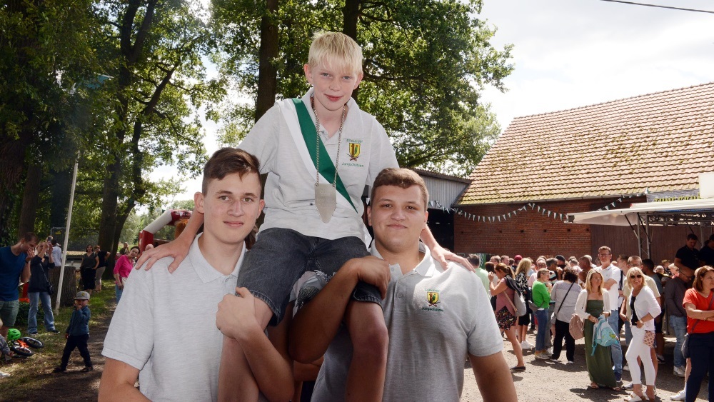 | Der neue Kinderkönig Leon Grell wurde von Michel Kötter (l.) und Moritz Toppmöller (r.) geschultert. |