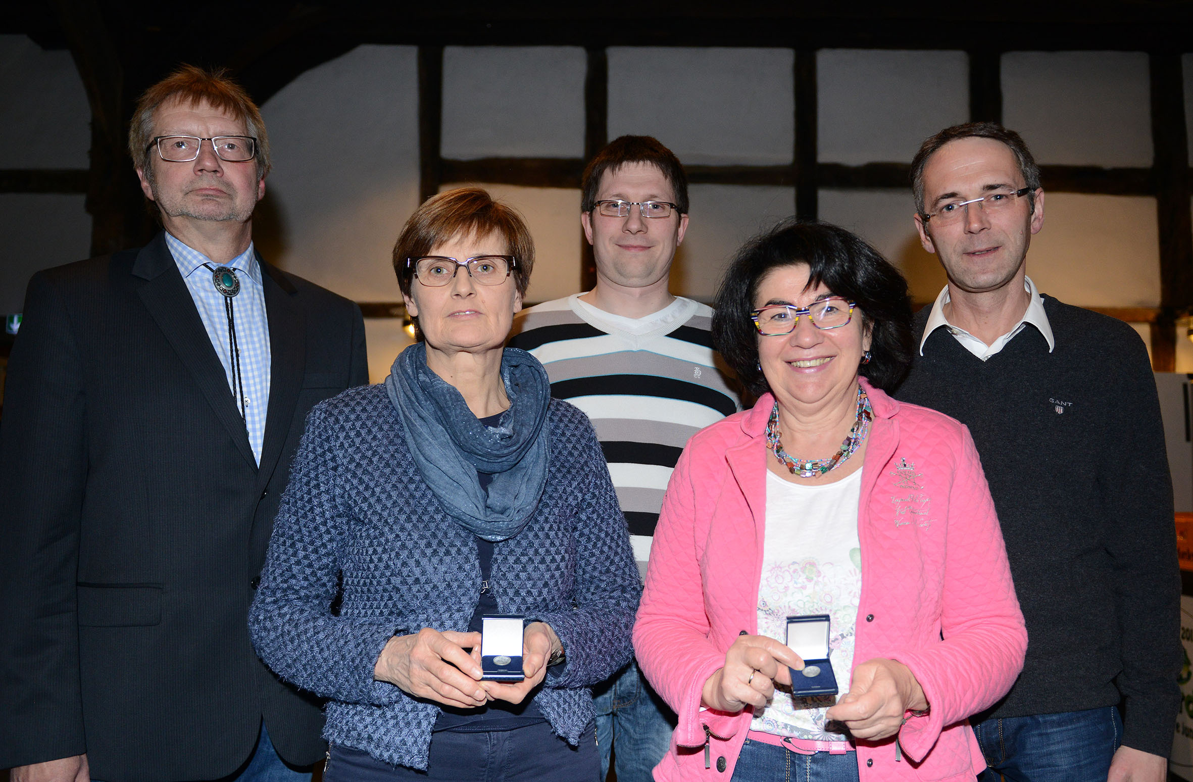 | Der Vorsitzende Werner Stüker (von links) zeichnete Petra Kreft, Maik Hollenhorst, Maria Unger und Michael Delker für 25-jähjrige Mitgliedschaft aus. |