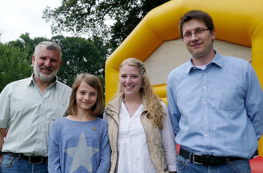 | Die neue Kinderkönigin von Spexard ist Maja Stüker. Die ersten Gratulanten waren Königin Simone Purkhart (r.) und König Rene Stüker (l.). |