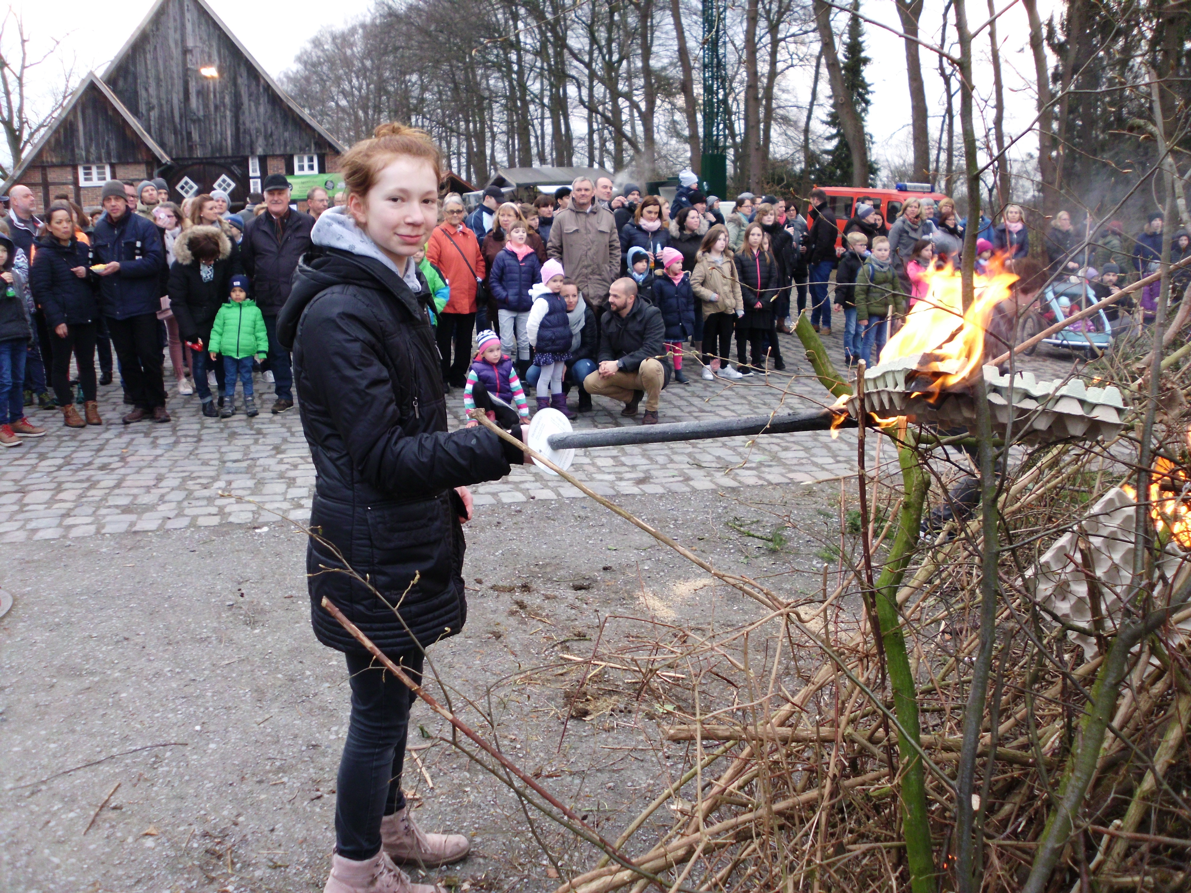 | Die Messdienerin Veronika Schmolka entzündete das Osterfeuer vor dem Spexarder Bauernhaus. |