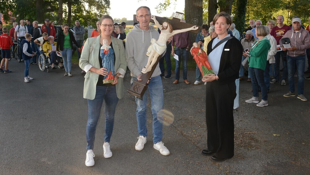 Der Prozessionszug war an der Straßenecke Im Brock/Plümersweg gestartet. Zu den Klängen des Musikzuges Spexard der Freiwilligen Feuerwehr ging es zur Hofstelle Meierfrankenfeld (früher Plümer). Die drei Heiligen-Figuren aus Ton wurden von der Heimatvereins-Vorsitzenden Theresa Westerbarkey (Maria), Inga Linzel (Johannes) und vertretend für die Nachbarschaft von Michael Delker (Christus am Kreuz) zum Heiligenhäuschen getragen. Hier warteten bereits Vikar Markus Henke und die Messdiener R