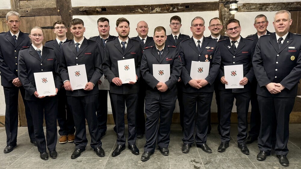 Ein weiterer Schwerpunkt des Abends waren die Beförderungen und Ehrungen, die die hohe Ausbildungs und Einsatzbereitschaft im Löschzug unterstrichen. Zu Feuerwehrmannanwärtern wurden Mick Pieper und Eileen Teeke ernannt. Nach erfolgreicher Ausbildung erhielten Luis Gollan und Philipp Holtkamp den Dienstgrad Feuerwehrmann. Zum Oberfeuerwehrmann wurden Kevin Köker, Thomas Martens und Jordan Tom Louis Neumann befördert. Den Dienstgrad Unterbrandmeister erhielten Markus Gerdelmann und Michael Steinkamp. Über die Beförderung zum Oberbrandmeister freuten sich Jan Eickhoff, Mirco Kreft, Nils Meiertoberens und Niklas Reimer. Zum Brandoberinspektor wurde Manuel Eickhoff ernannt. Darüber hinaus wurden mehrere Kameraden für ihre langjährige Zugehörigkeit zur Feuerwehr geehrt. Michael Steinkamp erhielt die Auszeichnung für 10 Jahre, Mario Kötter und Marius Eickhoff für 25 Jahre sowie Mirco Kreft für 35 Jahre aktiven Feuerwehrdienst.