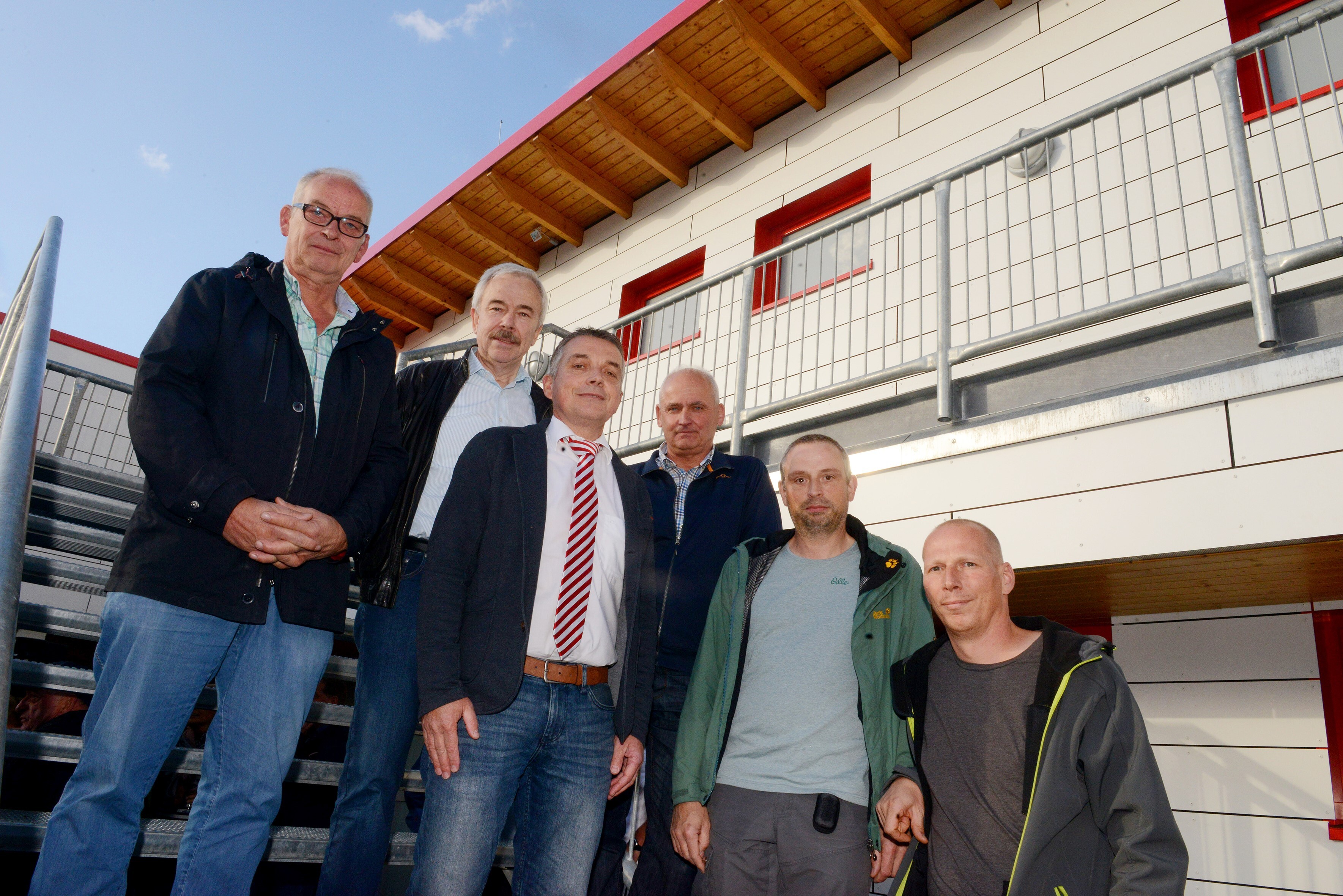 | Bei der offiziellen Einweihung stellten Hubert Kötter (v.l.), Wilhelm Kottmann, Volker Stickling, Ulrich Wittenbrink, Andreas von Boehn und Carsten Deiwiks das neue Sportheim des SV Spexard vor. |