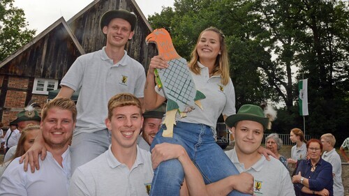 | Die neue Jungschützenkönigin Olivia Kötter wird zusammen mit ihrem König Max Wittkopp auf den Schultern zum Zelt getragen. |
