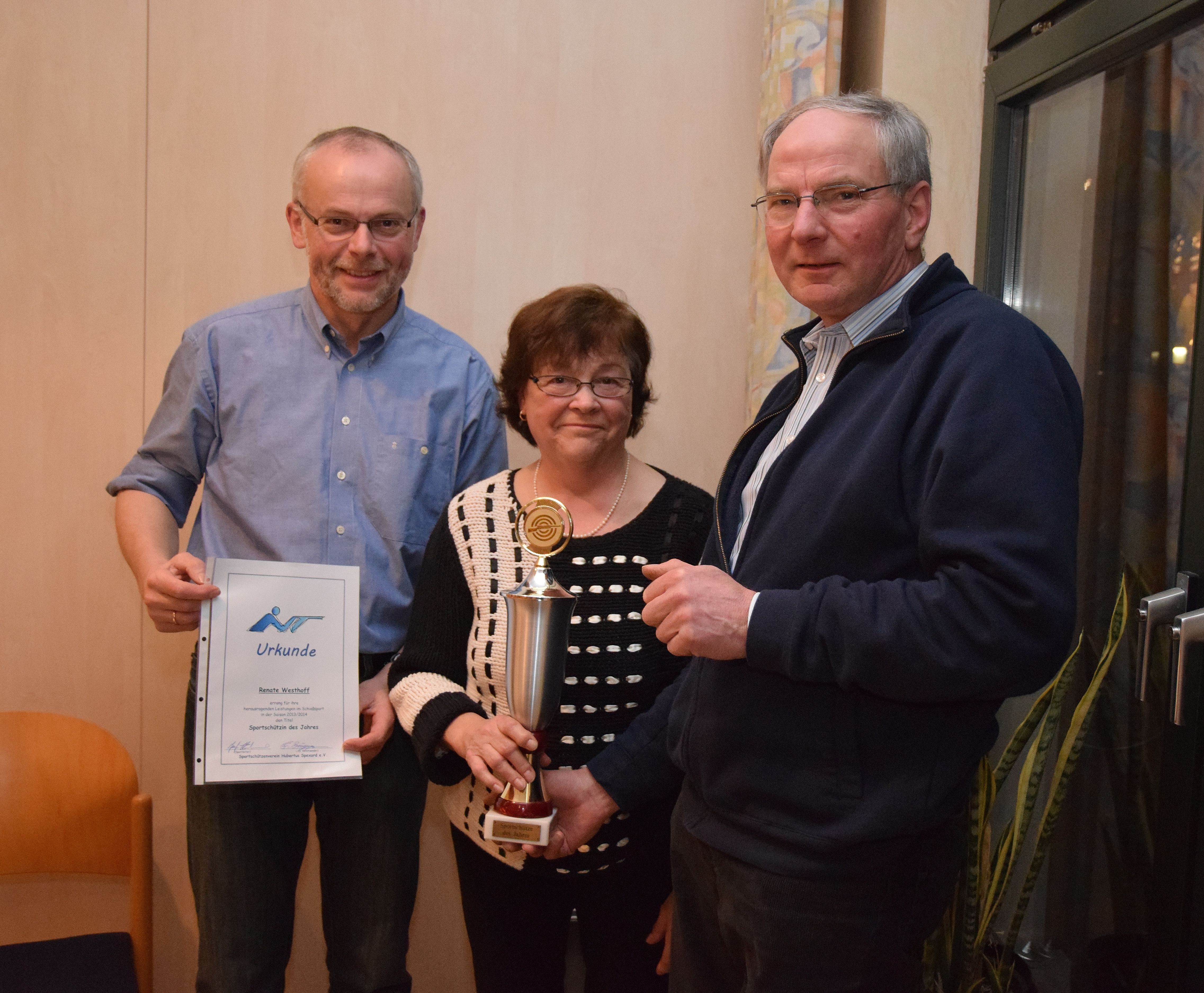 Sportschütze des Jahres Renate Westhoff. Es gratulieren Sportschützenchef Fridehelm Brüggemann (l) und Sportleiter Josef Thiesbrummel (r)