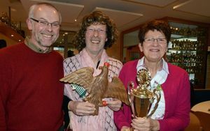 Sportschützenchef Friedhelm Brüggemann (l.) freut sich über die neue "Königin" Günter Melzer (m). (r) Die abgelöste Superkönigin Elisabeth Büscher.