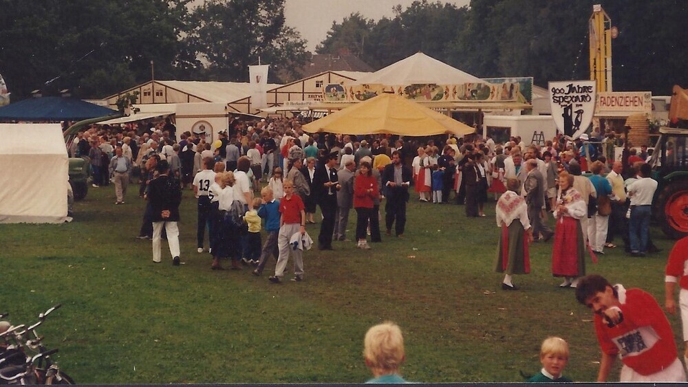 Der Höhepunkt des Jubiläumsjahres war das Volksfest auf dem Festplatz an der Bruder-Konrad-Straße. An allen vier Tagen war das Wetter gut, und so konnten die Veranstaltungen bei optimalen Bedingungen durchgeführt werden. Ein großer Torbogen mit Inschrift zum Jubiläum war eigens am Aufgang zum Festplatz aufgestellt worden. Das Volksfest begann am Freitag, 9. September, mit einer Jugend-Live-Fete im Festzelt. Es spielte die Band „Starlights“ aus Rheda-Wiedenbrück. Der Samstag, 10. September, begann um 14 Uhr mit einem Kinderfest auf dem Festgelände mit vielen interessanten Spielen. Um 15 Uhr startete das Dreschfest der Landwirte. Sie hatten dafür im Juli auf einem Feld des Hofes Determeyer Roggen nach alter Väter Sitte geerntet und per Hand zu Garben gebunden. Das Fuder wurde nun an die alte Dreschmaschine wie anno dazumal gefahren und auf dem Festplatz gedroschen. Den Kommentar zu dieser Tätigkeit und viele Erklärungen gab Heinrich Feldhans. Ein Teil des Festplatzes war in eine alte Spexarder Heidelandschaft mit Holzhürden für Schafe und Geflügel in der Voliere umgestaltet worden, um zu dokumentieren, wie es vor 900 Jahren in Spexard aussah. Auf dem Festgelände wurde Handwerk aus alter Zeit vorgeführt. Im Festzelt konnten Schnitzer, Spinner, Schuster und Holzschuhmacher bei der Arbeit beobachtet werden, und auf dem Festplatz arbeitete ein Seiler an seinem Gerät. Weiter zogen eine Feldschmiede mit Hufschmied und alte landwirtschaftliche Tätigkeiten die vielen Besucher in ihren Bann. Die Tanzgruppe der Landfrauen trat auf, und die Landfrauen boten Gerichte wie zu Großmutters Zeiten an. Zum Gewichtschätzen wurde eine Milchkuh angebunden. Ab 20 Uhr spielten die „River Boys“ zum Festabend auf. Eine mit der Eintrittskarte verbundene Verlosung ergab als Hauptgewinn eine Fahrt mit dem Heißluftballon.