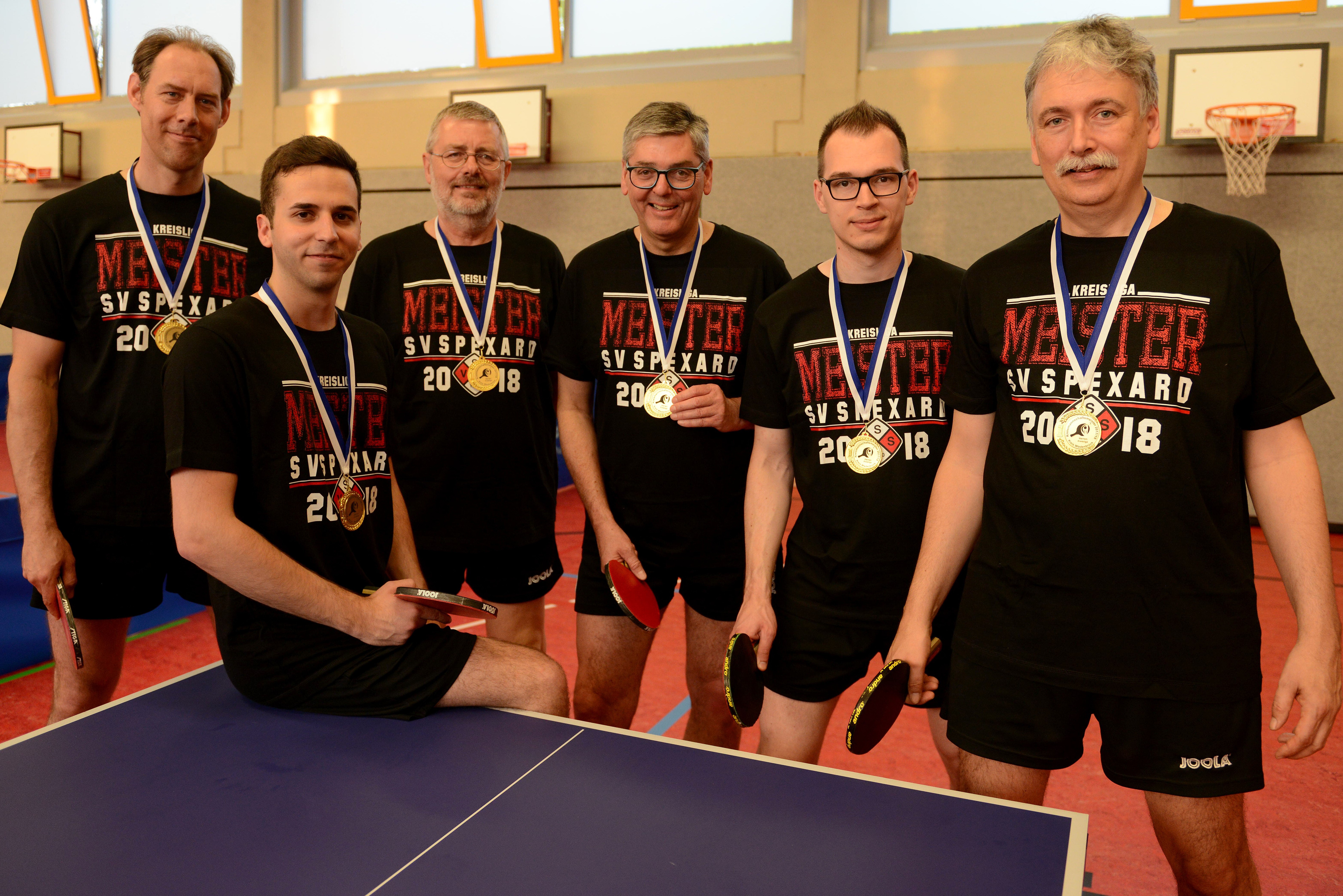 Die Meisterschaft in der Tischtennis-Kreisliga und die Rückkehr in die Bezirksklasse feierte der SV Spexard II mit der achtbaren Bilanz von 43:1-Punkten. Am letzten Spieltag gewann die Spexarder gegen den Zweiten Post SV Gütersloh II mit 9:2. „Die Mannschaft ist souverän Meister geworden und war das beste Team in der Klasse“, lobte Kreissportwart Ludger Terhechte die starke Leistung des Meisters und übergab am letzten Spieltag die Meistermedaillen in der Sporthalle der Josefschule. Zur Mannschaft gehören Jan Behrendt (von links), Felix Nolting, Reinhard Grund, Claus Vöhringer, Sebastian Kebekus und Martin Wittkamp.