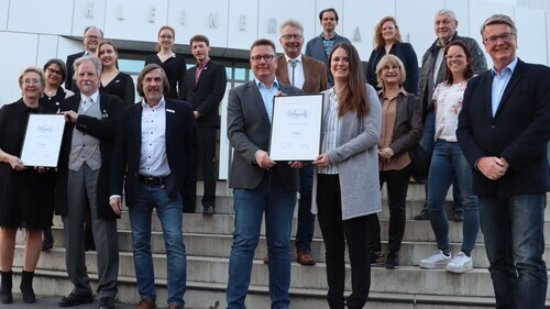 | Heimatpreisverleihung mit Bürgermeister und Kultur-Beigeordnetem an die Bürgerbühne Gütersloh (l.) und den Heimatverein Spexard. |