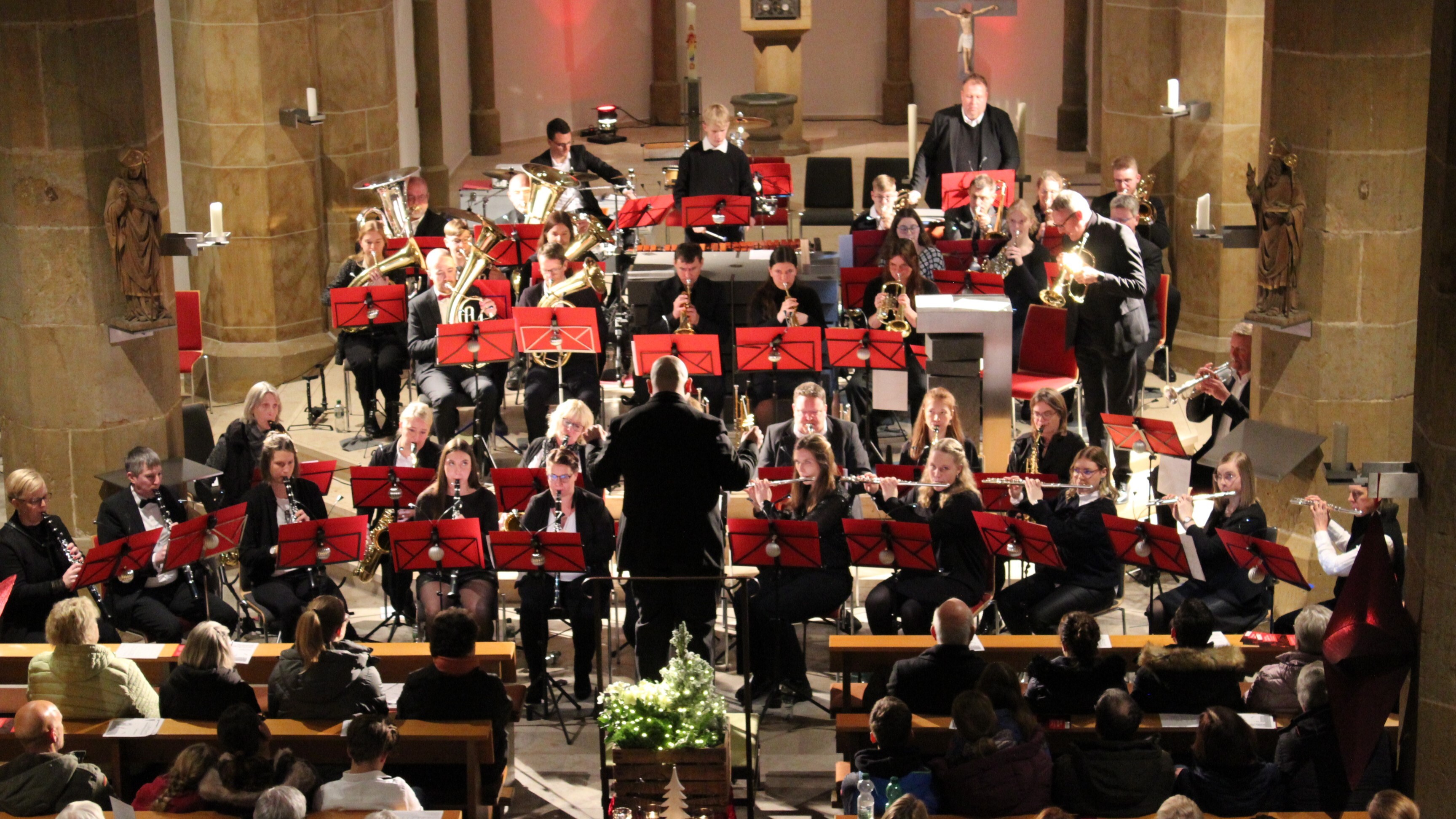 Die erwachsenen Musikerinnen und Musiker aus dem Musikzug füllten das Kirchenschiff mit ihren Melodien von Beginn an aus. Schon bei den ersten Tönen eines Weihnachtsmedleys mit bekannten Liedern wie „Stille Nacht“ oder „Jingle Bells“ oder auch dem gefühlvollen „Andachtsjodler“ zeigte sich wie volltönig das Ensemble klingt, mit der Akustik in der Kirche wurde eindrucksvoll gespielt. Mal fulminant im Forte, dann leise und geheimnisvoll – die Musikerinnen und Musiker unter der Leitung von Dirigent Andrii Stadnjuk zeigten die große Bandbreite der Blasmusik. Majestätische Trompeten, der tiefe Bass der Tuben oder saubere Einsätze von Hörnern – jede Instrumentengruppe wusste zu begeistern und vermittelte eine große Freude am Spiel, am Zusammenspiel. Überaus deutlich wurde diese Freude an der Musik und an der Advents- und Weihnachtszeit, wenn die Percussion-Instrumente, insbesondere das Glockenspiel und Schellenkränze zum Einsatz kamen. Man fühlte sich wie auf einer fröhlichen Schlittenfahrt durch weiße Winterlandschaften.