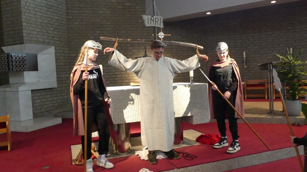Die Kreuze in der St. Bruder Konrad-Kirche sind verhüllt. Die Heilige Woche steht unmittelbar vor der Tür. Am Abend des Palmsonntags wurde schon zum siebten Mal die Passion gespielt, also die Erzählung vom Leiden und Sterben Christi. Die Darsteller hatten sich im Vorfeld zu vier Proben getroffen. In diesem Jahr hatten Anne Eickhoff und Sarah Meiertoberens die Vorbereitung des Passionsspiels übernommen. Sarah Meiertoberens war sehr dankbar, dass so viele Zuschauerinnen und Zuschauer in die Kirche gekommen waren. „Ich freue mich, dass Sie alle gekommen sind. Nachdem wir unser Heiliges Spiel zweimal überhaupt nicht und letztes Jahr mit vielen Einschränkungen aufführen konnten, können wir heute das erste Mal seit drei Jahren ohne Einschränkungen spielen“ Zusammen mit den Kommunionkindern wurde zunächst der Einzug in Jerusalem dargestellt. Jesus wird feierlich begrüßt. „Hosanna dem Sohne Davids“ schreit die Menge. In der nächsten Szene fragt Judas nach der Bezahlung, wenn er Jesus den Hohepriestern ausliefern würd