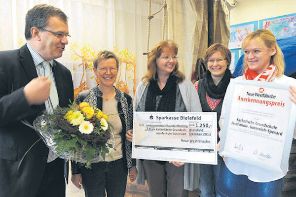 Kreative Ideen, gute Konzepte, erfolgreiche Projekte: Mehr als 30 Schulen, Vereine und andere Institutionen haben sich auf den Förderpreis "Lesenswerte Projekte" der Neuen Westfälischen beworben. Die Jury hat die vier überzeugendsten Projekte in Ostwestfalen-Lippe ausgewählt. Eines davon ist das Projekt "Lesepatenschaften" der Josefschule in Spexard. Der Chefredakteur der NEUE WESTFÄLISCHEN, Thomas Seim, überreichte der katholischen Grundschule gestern den Preis - einen Blumenstrauß, eine Urkunde und 1.250 Euro. Das Geld will die Schule nutzen, um davon neue Bücher für die Schulbibliothek zu kaufen. Denn: Die Bücherei wird rege genutzt. Schon immer, nun noch mehr. Mit "Lesepatenschaften" hat die Schule ein Projekt entwickelt, über das es gelungen ist, die Lesefreude bei den jungen Kindern beträchtlich zu steigern.