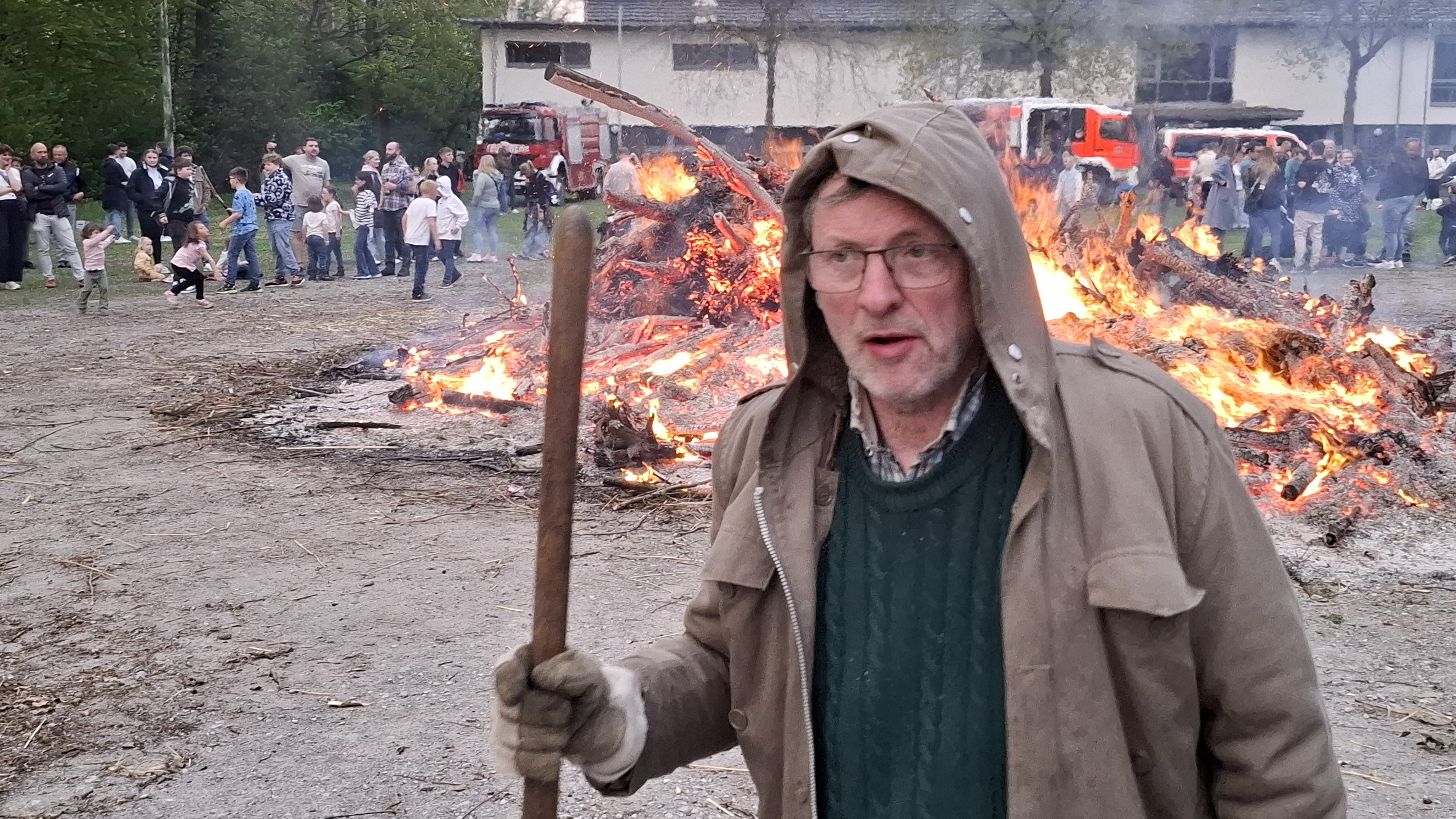 Der Heimatverein lädt die Bevölkerung bereits seit 1995 vor das historische Bauernhaus ein. Einer, der seitdem dabei war, ist „Feuermeister“ Johannes Hollenhorst. Er ist seitdem für das Zusammenschieben der Glut zuständig, damit am nächsten Tag nur noch ein kleiner Berg Asche übrigbleibt. Diese Aufgabe hat er nun zum letzten Mal übernommen. Er legt die Aufgabe ab dem nächsten Jahr in jüngere Hände. Wie jedes Jahr sicherte der Löschzug Spexard der Freiwilligen Feuerwehr die Feuerstelle ab. Der Heimatverein bot währenddessen gekühlte Getränke und weitere Kameraden des Löschzuges Bratwurst und Pommes an.