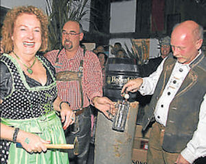 | Fass-Anstich: (v. l.) Stadtkönigin Ulrike Degener von den Kattenstrother Schützen, Organisator Oliver Kramer und Herbert Degener. |