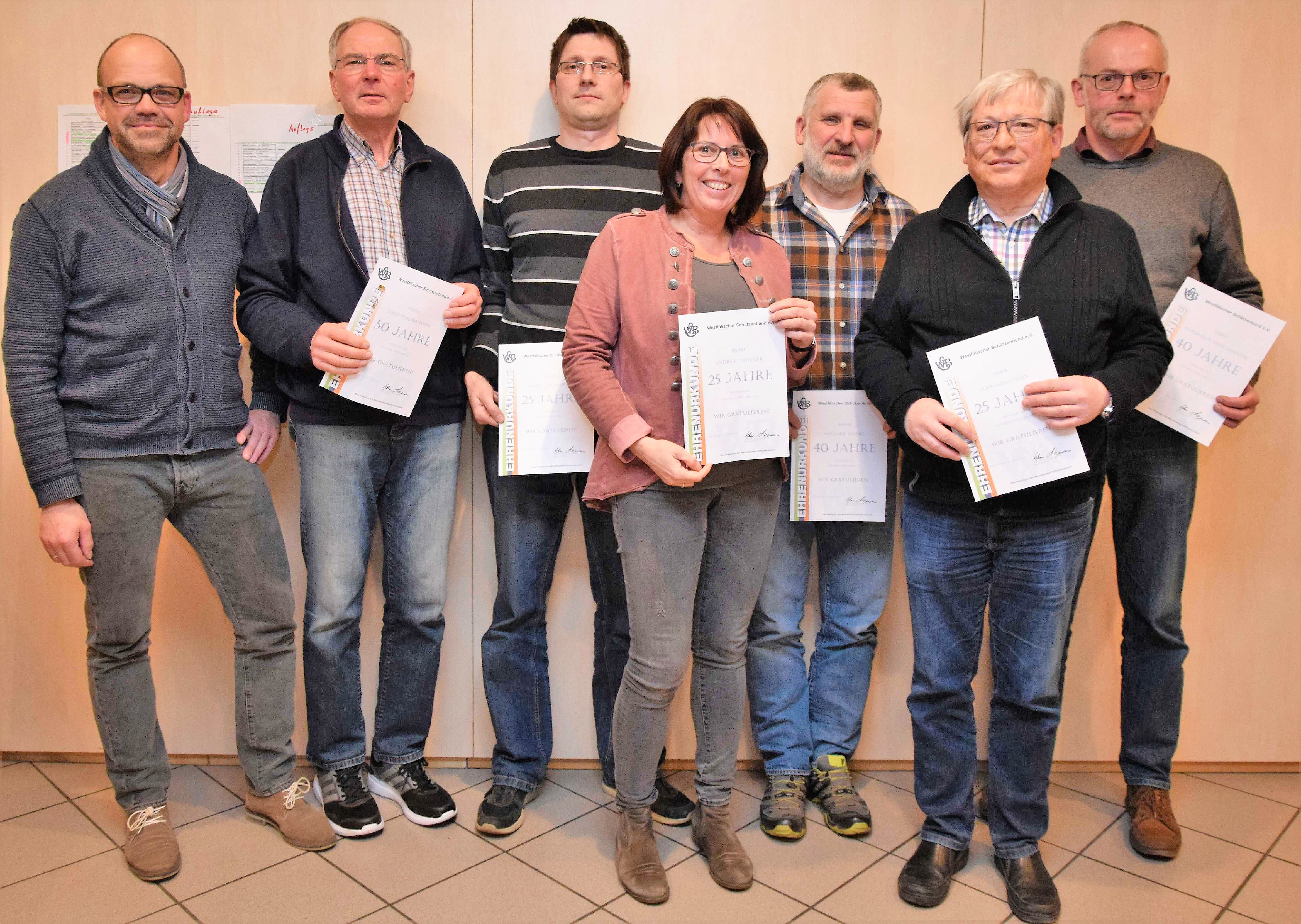 Der Verein hat 154 Mitglieder und nimmt mit acht Mannschaften an den Rundenwettkämpfen des Bezirksverbandes Wiedenbrück teil. Im Bezirk Ostwestfalen schießen zwei Mannschaften in der Kreis - und Bezirksliga. Den Orden für besondere Verdienste erhielt Renate Westhoff. Die Seniorin wurde in ihrer Laufbahn sechsmal Landesmeisterin ihrer Altersklasse und einmal Deutsche Meisterin. Für 25-jährige Mitgliedschaft wurden Andrea Drücker, Maik Hollenhorst, Thomas Johannhörster, Werner Küster, Sandra Sandbote, Manfred Unger und Christiane Westhues geehrt. Seit 40 Jahren halten Friedhelm Brüggemann, Richard Proske und Gregor Siemer den Sportschützen die Treue und seit 50 Jahren ist Sportwart Josef Thiesbrummel ein Schütze. Das beliebte Spexarder Vereineschießen wird in diesem Jahr vom 7. bis zum 17. Mai ausgetragen.