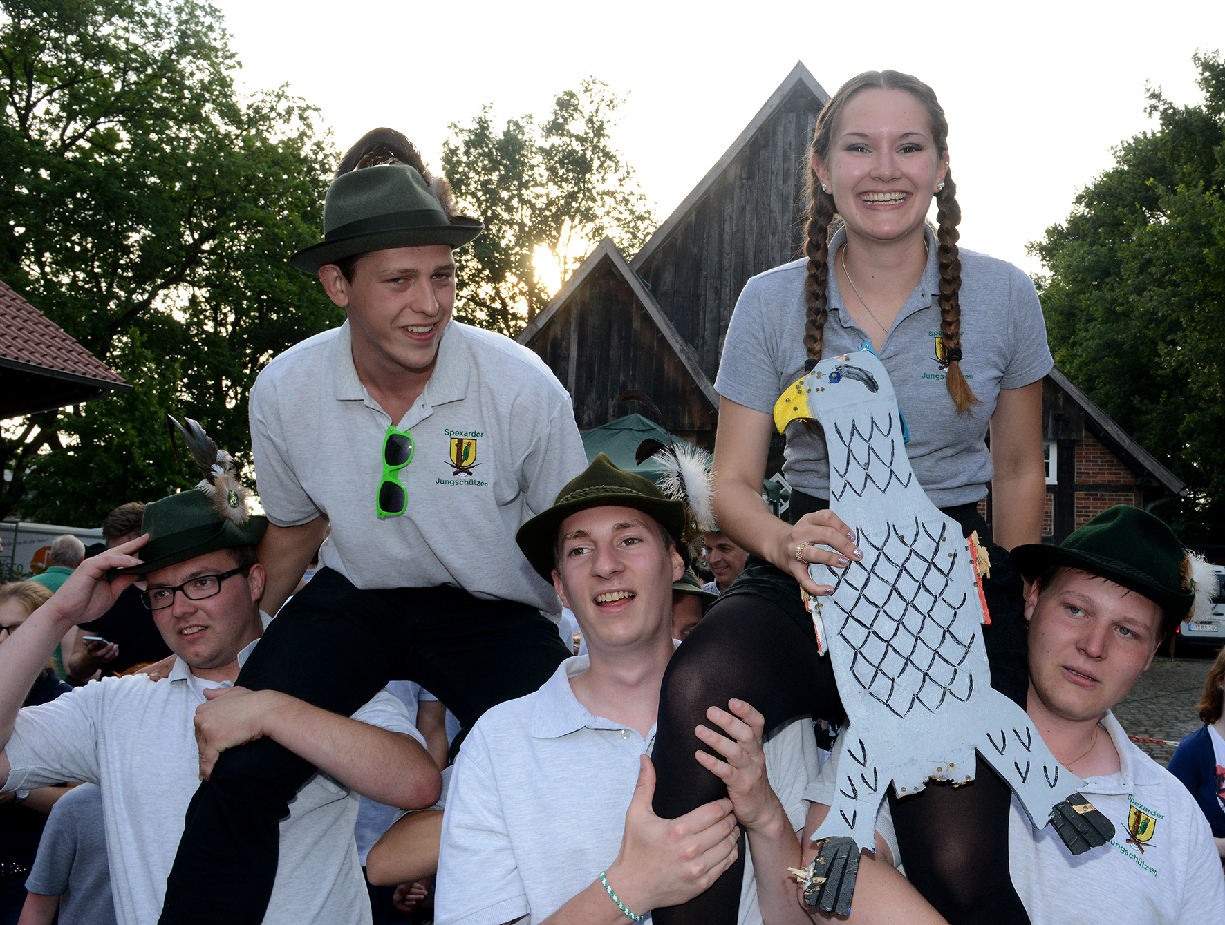Rund 150 Schützen waren traditionell mur mit Hut am Freitag um 18 Uhr an der Bruder-Konrad-Kirche angetreten und marschierten in Begleitung des Musikzuges Spexard zum Festplatz. Dort stand das Fest ganz im Zeichen der Jungschützen, die am Bauernhaus angekommen mit dem Vogelschießen begannen. Die Krone des Holzadlers schoss Martin Bachner mit dem 38. Schuss. Marie Kahlert holte die Krone mit dem 63. Schuss herunter. Das Zepter folgte mit dem 125. Schuss durch Michael Steinkamp. Nachdem Leandro Polo-Morawietz mit dem 163. Schuss dem rechten Flügel und Daniela Riechert dem linken Flügel mit dem 192. Schuss den Rest gaben, holte sich Nina Eickhoff mit dem 211. Schuss den Rumpf des Vogels.