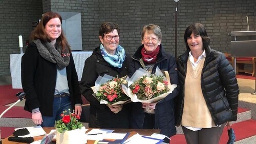 | Eva-Maria Dierkes (links) und Claudia Fichtner (rechts) verabschieden Agnes Mertens (2.v.l.) und Rita Kordwittenborg. |