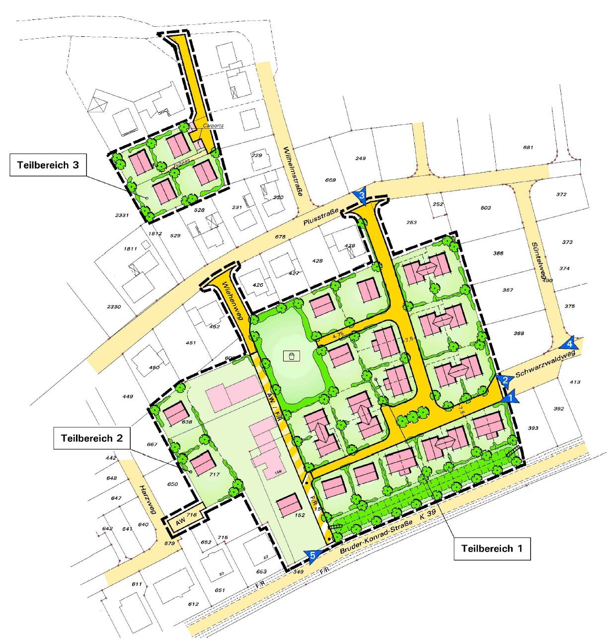 Das Plangebiet umfasst drei Teilbereiche. Den zentralen Teil des Bebauungsplangebietes bildet der östlich des Wiehenweges gelegene Teilbereich 1. Dieser soll als Allgemeines Wohngebiet (WA) ausgewiesen werden. Die Erschließung erfolgt von der Piusstraße und vom Schwarzwaldweg her. Im Nordwesten ist ein größerer Kinderspielplatz vorgesehen, der auch die umliegenden Wohnbereiche mit versorgen soll. Der im Bebauungsplan Nr. 1/5 (Spexard) festgesetzte private Spielbereich am Harzweg und der durch den Bebauungsplan Nr. 1/1 (Spexard) gesicherte Spielplatz an der Wilhelmstraße sollen aufgegeben und zugunsten dieses größeren, zentraler gelegenen Spielplatzes zusammenfasst werden. Die beiden aufgegebenen Standorte sollen stattdessen einer Wohnbebauung zugeführt werden (Teilbereiche 2 und 3).