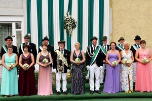 Zur Throngesellschaft gehören von links: Frederik und Madeleine Lewicke, Martin und Sandra Westhues, Raimund und Dorothea Schmolka, das Königspaar Irene II und Günter II Melzer, Adjutant Malte Lucietto, Udo und Beate Pollmeier, Richard und Monika Proske und Andreas und Agnes Koch.