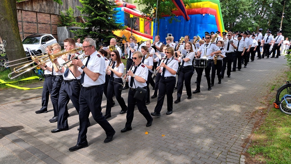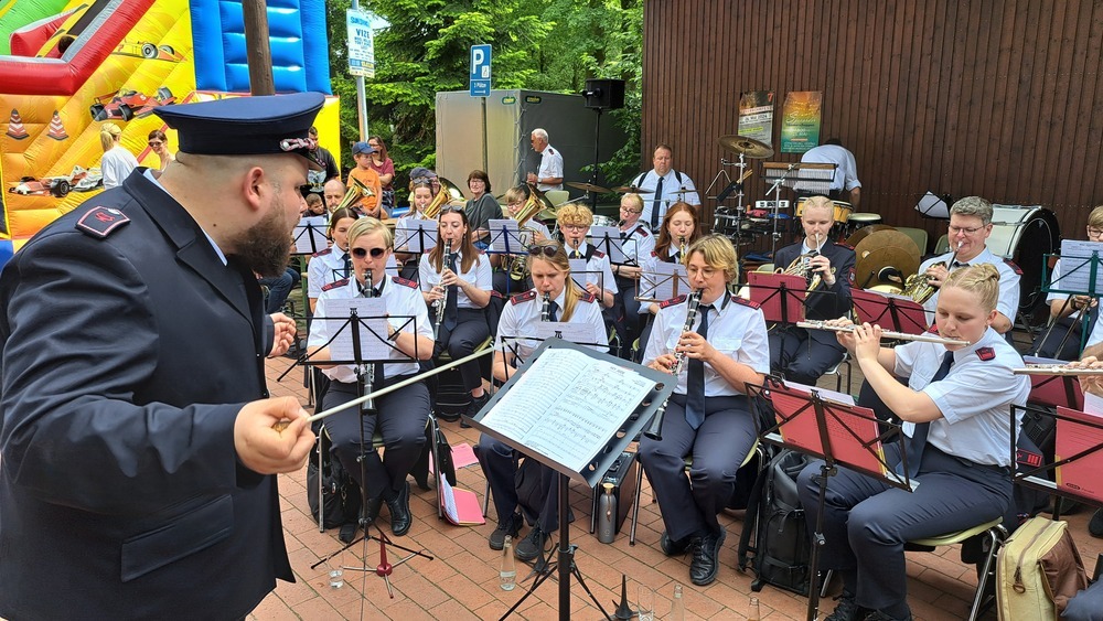 | Unter der Leitung von Andrii Stadniuk (links) spielte der Musikzug Spexard an beiden Tagen beim diesjährigen Feuerwehrfest. |