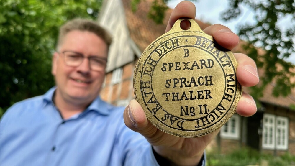 Die Gütersloher Region ist reich an Besonderheiten: Eine davon sind die sogenannten „Sprachthaler“, die in den damaligen Bauerschaften und Dörfern vor etwa 200 Jahren eine zentrale Form der offiziellen Kommunikation darstellten. „Behalt mich nicht das rath ich dich“ ist zum Beispiel auf der Vorderseite einer Replik des Spexarder Exemplars zu lesen, das Christian Janzen (54) als Schriftführer des dortigen Heimatvereins in der Hand hält. „Die Inschrift machte unmissverständlich klar: Die mit dem Sprachtaler verbundene Nachricht musste unverzüglich, meist innerhalb der nächsten Stunde, zur nächsten Hofstelle weitergeleitet werden“, berichtet Janzen, der das letzte bekannte Original dieser Spexarder Nachrichten-Plakette, auch Bauerntaler oder Burdaler genannt, im April 2021 gemeinsam mit Vereinskollege Markus Schumacher dem Stadt- und Kreisarchiv Gütersloh zur sicheren Aufbewahrung übergab.