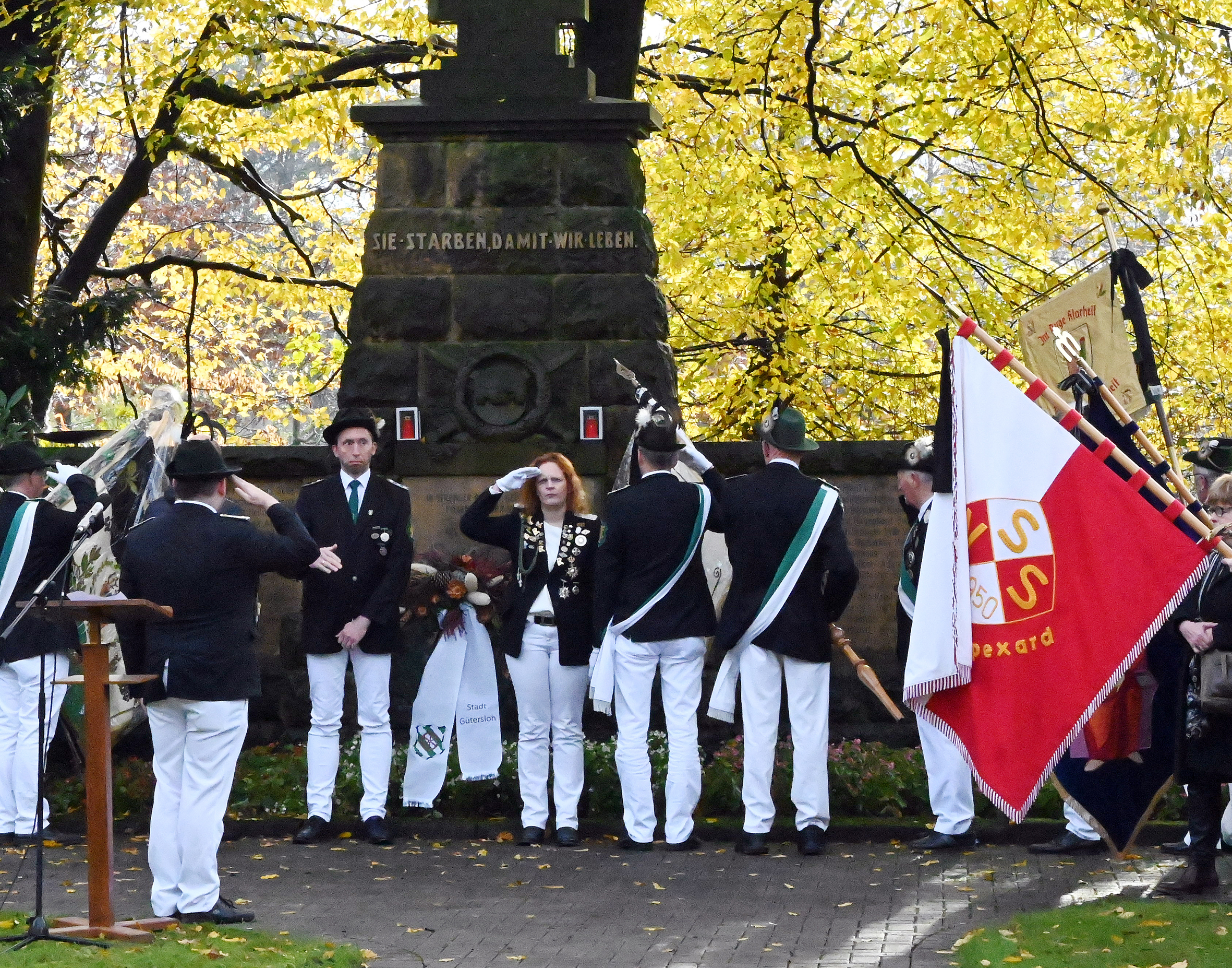 Die Feierstunde am Volkstrauertag in Spexard wird von der Schützenbruderschaft St. Hubertus ausgetragen und hat eine sehr lange Tradition. Der Einladung waren die Abordnungen der heimischen Vereine und der Landsmannschaften gefolgt. Nach dem Trauermarsch vom Kirchhof zum Kriegerdenkmal spielte der Musikzug Spexard der Freiwilligen Feuerwehr einen Choral und am Ende der Veranstaltung die Nationalhymne vor rund 150 Teilnehmern.