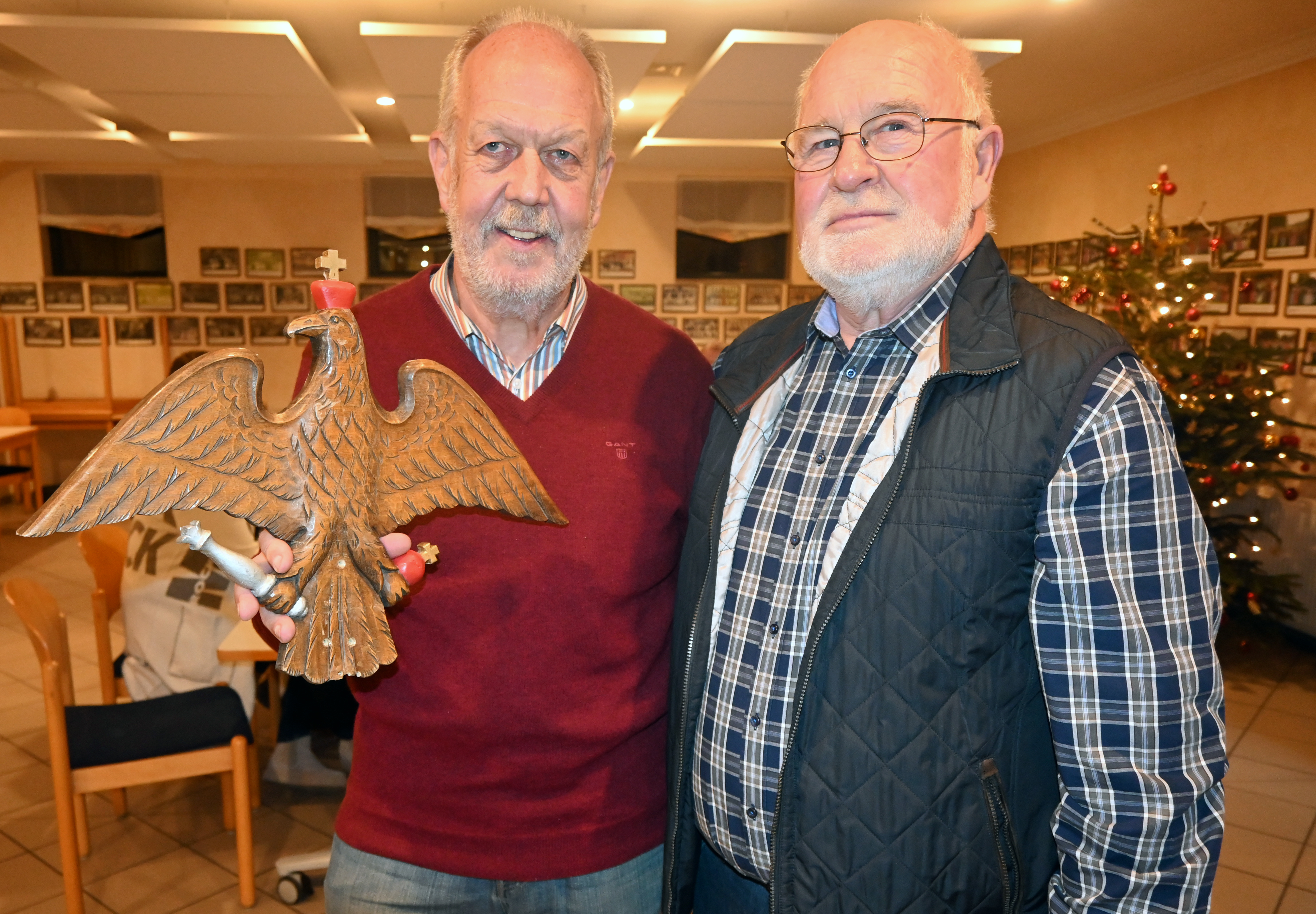 Neuer König der Könige wurde Alfons Hollenhorst (l.). Den Holzvogel als Zeichen der Würde überreichte ihm sein Vorgänger Burkhard Willmann.