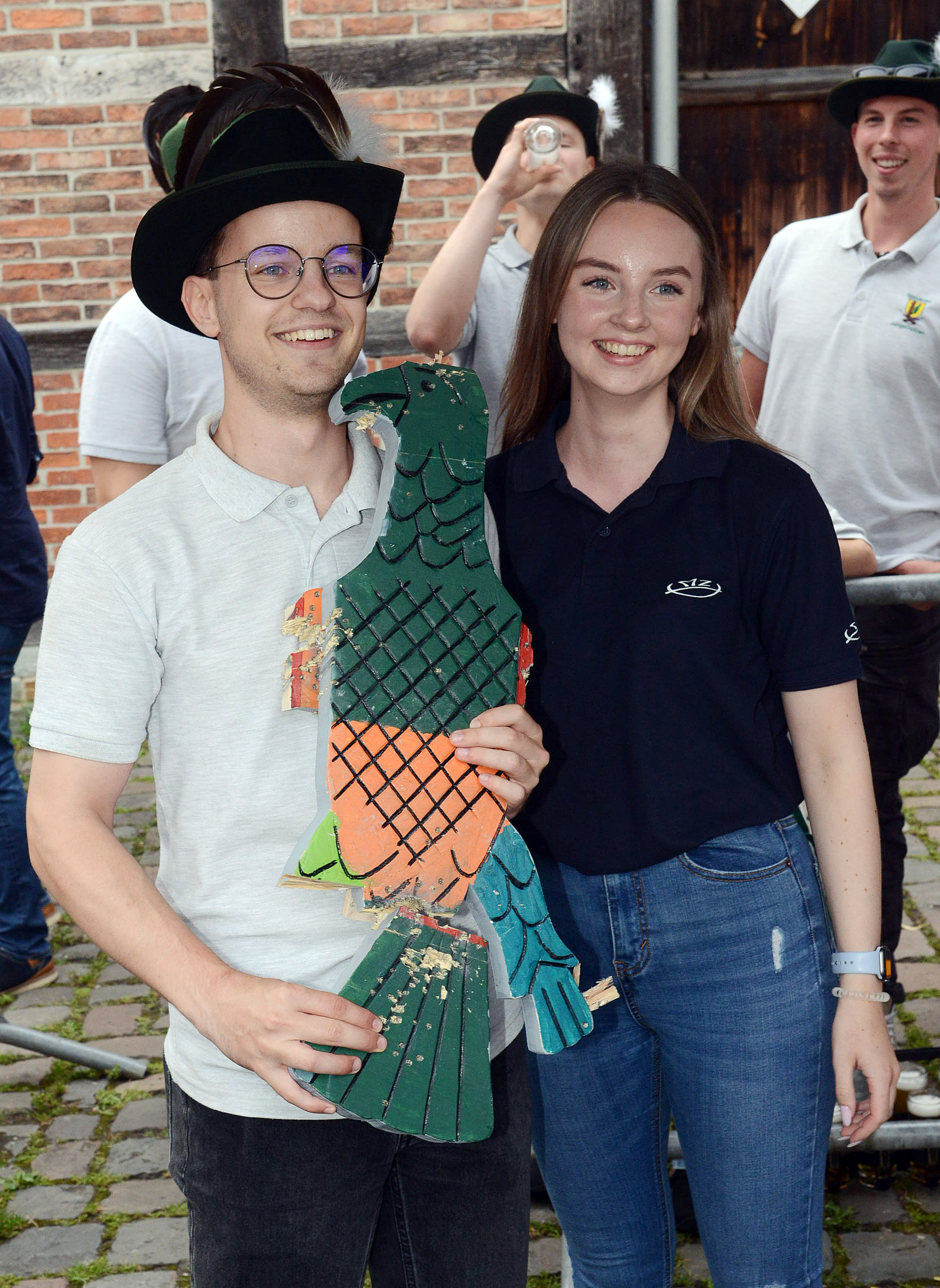 Das dramatische Vogelschießen der Jungschützen mit zehn ernsthaften Bewerbern gewann am Freitag Lennard Stüker. Der 24-jährige Industriekaufmann schoss um 19.57 Uhr mit dem 345. Schuss den Holzvogel aus dem Kugelfang. An seiner Seite regiert Hannah Fortenbacher (19) die Jungschützen der St. Hubertus Schützenbruderschaft, die mit dem 59. Schuss dem Adler die Krone raubte. Den Apfel trennte Lea Brockmann mit dem 88. Schuss vom Vogel. Das Zepter errang Maja Stüker mit dem 110. Schuss und die beiden Flügel trennten Joris Luhmann und Rick Westhoff vom Haupt der hölzernen Greifs.