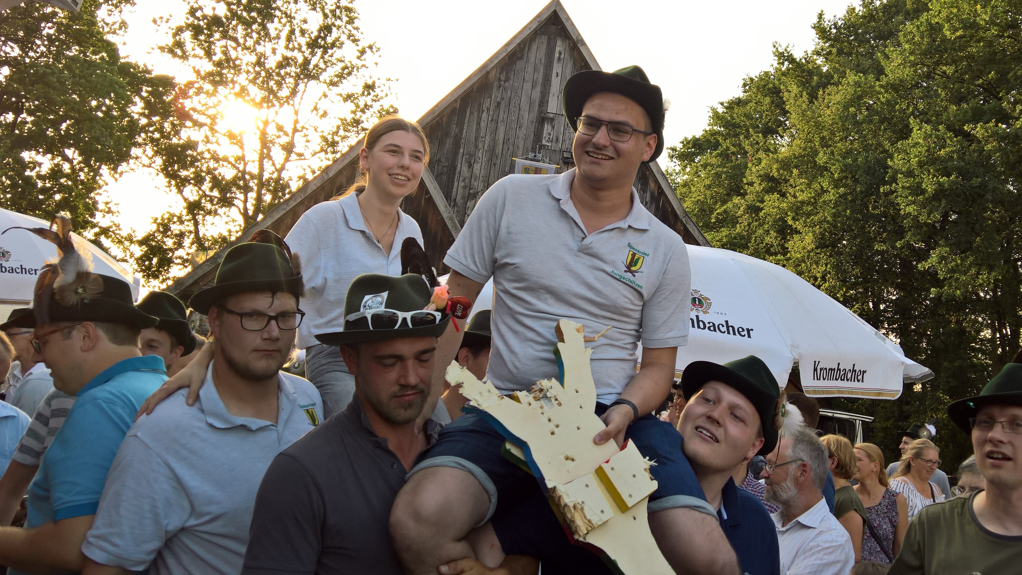 | Auf den Schultern der Jungschützen wurden der neue Jungschützenkönig Niklas Reimer und Königin Jessica Wullenkord ins Zelt getragen. |