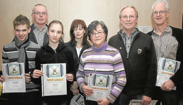 Vereinsmeister: Michael Steinkamp, Vorsitzender Friedhelm Brüggemann, Aileen Kahlert, Anja Kahlert, Renate Westhoff, Udo Pollmeier, Norbert Brinkrolf (v.l.)