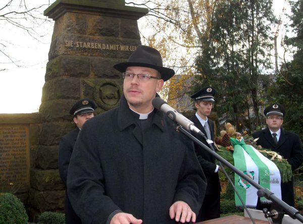 Die Ortsvereine beteiligten sich wieder an der Feierstunde zum Volkstrauertag mit Fahnenabordnungen und Uniformierten, um den Opfern von Kriegen und Verbrechen zu gedenken. Die Organisation lag in den bewährten Händen der Kriegerkameradschaft, die einen Kranz niederlegte. Die Feuerwehrkapelle Spexard und der Kirchenchor der Bruder-Konrad-Kirchengemeinde leisteten die musikalischen Beiträge. Die Ansprache hielt der Bezirksjungschützenpräses Jörg Plümper. „Der Frieden muss immer neu geschlossen werden und darf nicht in Vergessenheit geraten“, sagte der Paderborner, der die Gedenkstunde als Kontrapunkt für den Frieden sieht, weil unsere Gesellschaft auf dem Weg einer Entfremdung ist. „Die Traditionen geraten in Vergessenheit. Wir erleben aktuell eine Spaßgesellschaft die sich an so etwas nicht erinnern will. Geschichtsverlust ist Gesichtsverlust.“