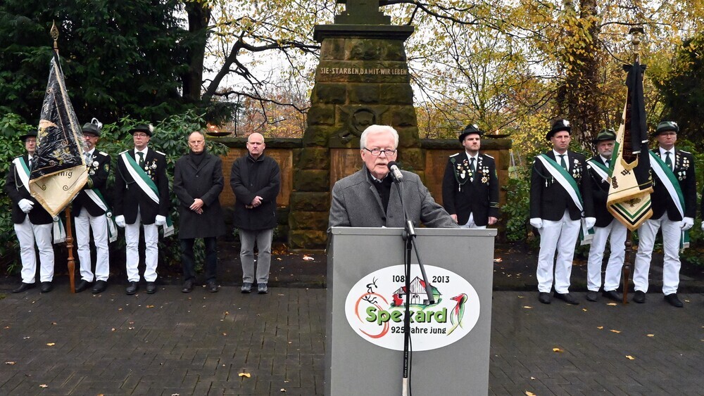 Jedes Jahr findet zwei Sonntage vor dem ersten Adventssonntag in Deutschland der Volktrauertag steht. Die Feierstunde in Spexard wird seit der Einweihung des Ehrenmals im Jahre 1926 abgehalten. In diesem Jahr sprach Walter Bartonitschek zu den Bürgern und den Vertretern der ortsansässigen Vereine und den Landmannschaften der Ostpreußen und Schlesier. „In keinem Land der Welt ist der Heldenbegriff so missbraucht worden wie in Deutschland. Tapferkeit und Heldenmut und Vaterlandstreue des untergegangenen Kaiserreiches bestimmten in den Anfangsjahren das Gedenken an die Kriegsopfer. Viele glaubten noch an die Parolen vom Heldentot und die Dolchstoßlegende“, erinnerte Bartonitschek an die Zeit in denen die Kriegerdenkmäler mit patriotischen Innenschriften in den 1920er Jahren entstanden. „Sie starben damit wir Leben“ ist in Spexard zu lesen. „Es sollte Trost gespendet werden für die Mütter und Witwen mit Kindern, die ohne Söhne, Männer und Väter waren. Trauer und Leid sollten erträglicher werden. Heldenhaft und tapfer sind die Männer für das Vaterland gefallen hieß es in jener Zeit“, so Bartonitschek, der von zwei Schicksalen getöteter Soldaten aus beiden Weltkriegen berichtete.