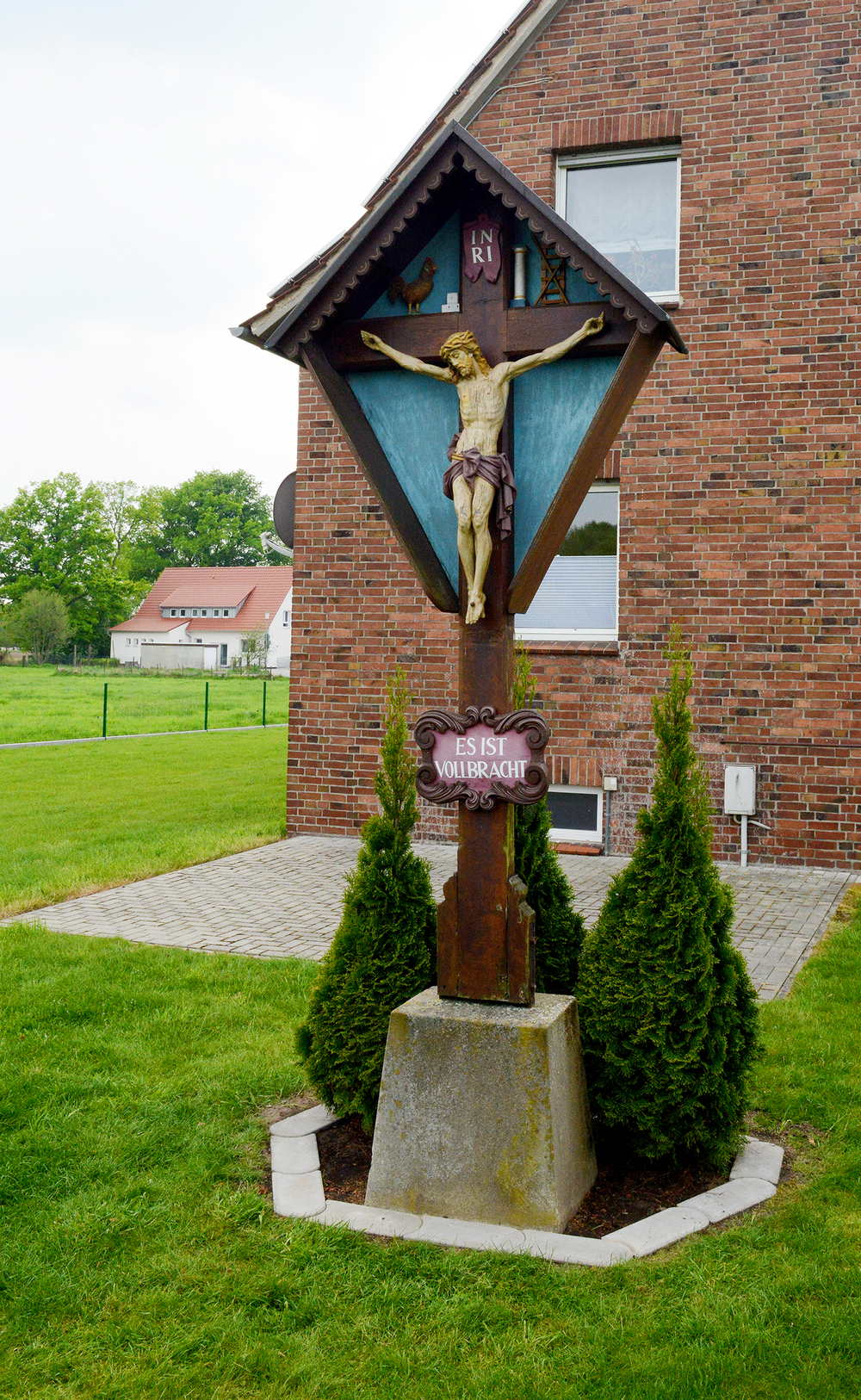 „Am hl. Karfreitag des Kriegsjahres 1915 hat die Familie Colon Stüker von hier ein schönes Kreuz errichten und durch den Herr Vikar Schulte einweihen lassen. Die Nachbarn wohnten der Einweihung andächtig bei. Das Kreuz, beschattet von Tannen, steht am Wege zw. Colon Stüker und Colon Kosfeld.“