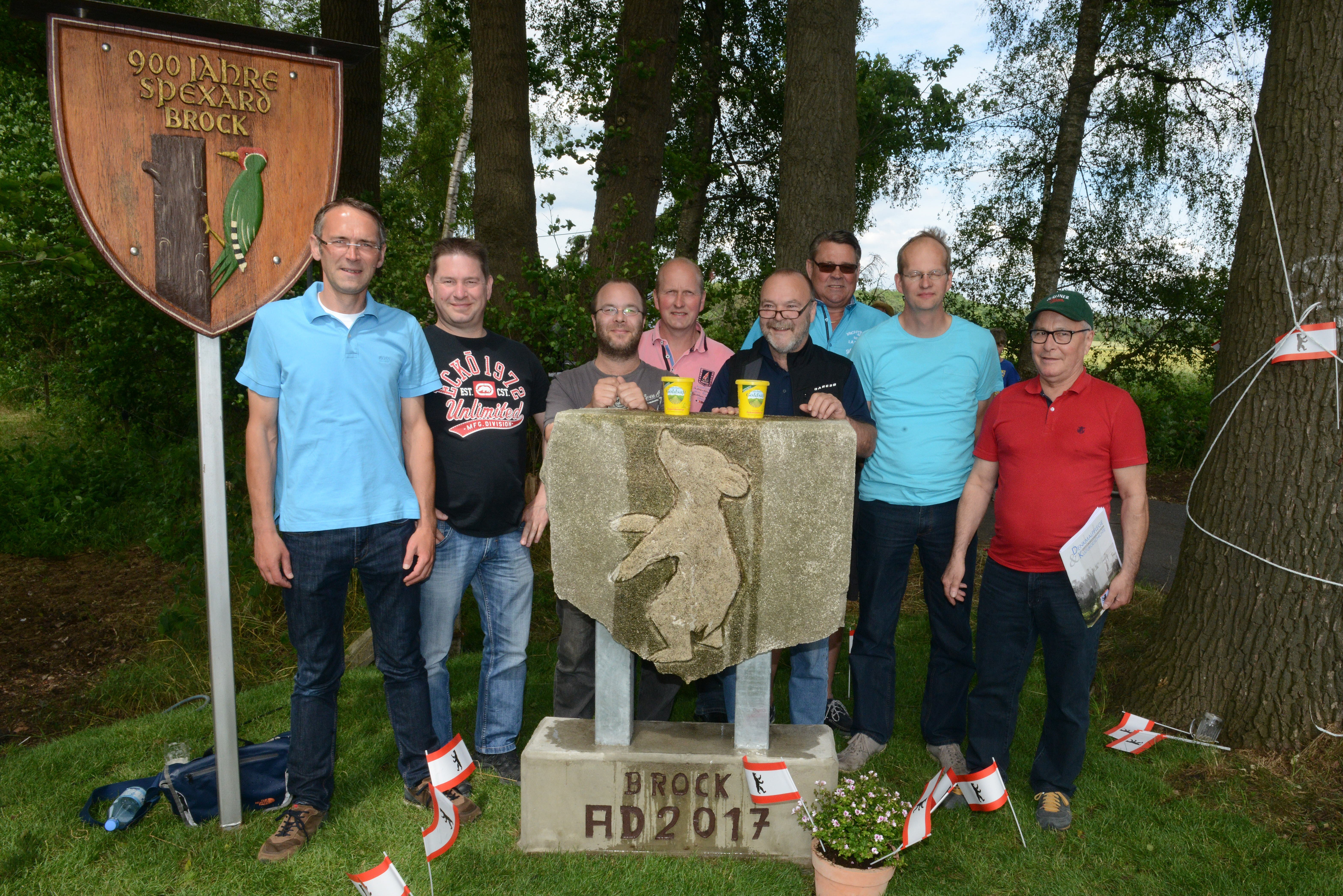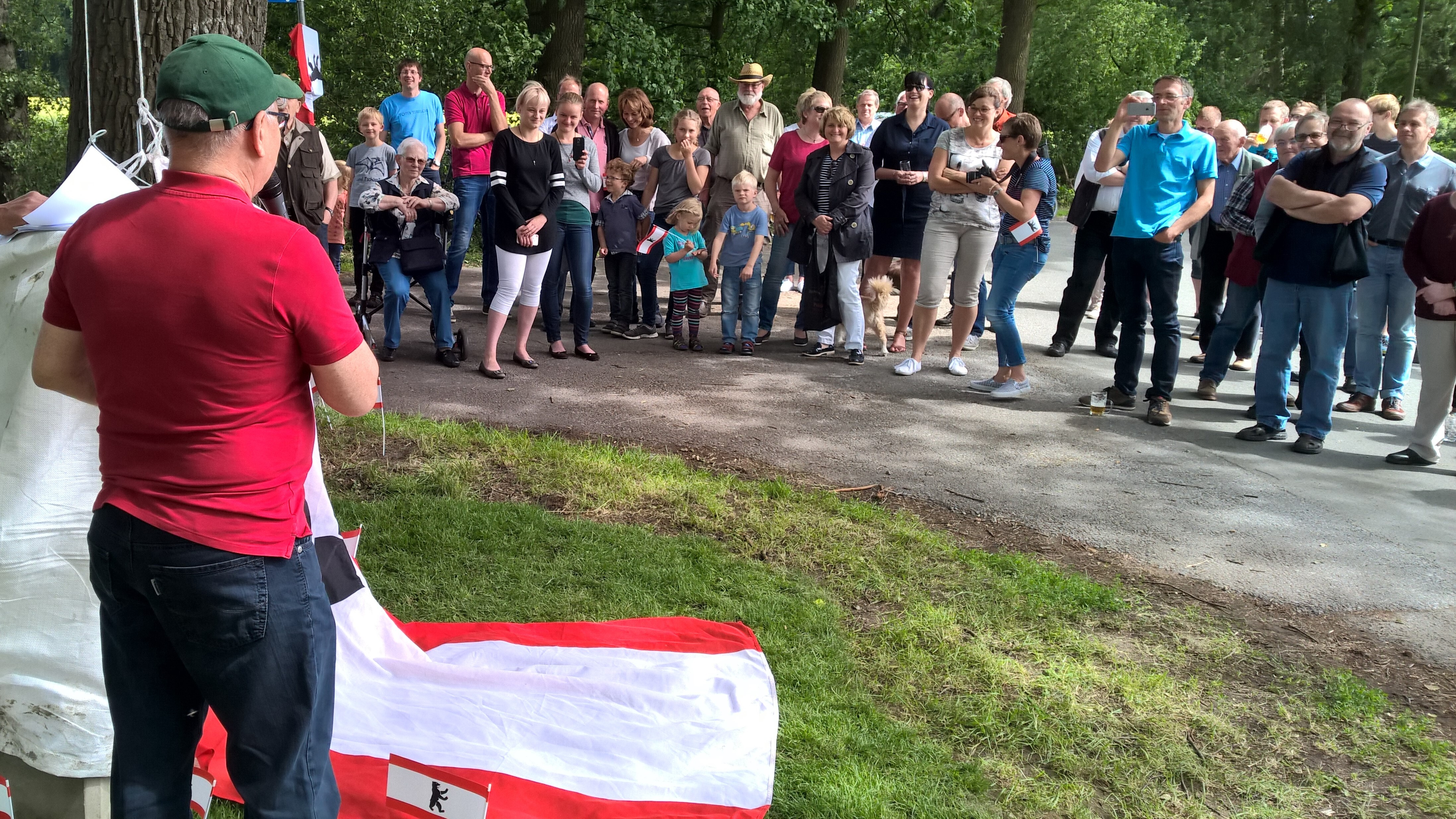 Das Fragment des Berliner Meilensteins an der Autobahn bei Spexard hat nach 21 Jahren einen neuen Platz gefunden. Am 10. September 1996 wurde die Ruhe des Bären jäh gestört. Ein mit Rübenkraut beladener Laster riss das 1954 aufgestellte Wahrzeichen vom Sockel und brach es in mehrere Teile. Die Bürger vom Brock und der Heimatverein stellten die damals sichergestellten Reste jetzt wieder auf und am Tag genau 21 Jahre nach dem Unfall wurde das Bruchstück am Plümersweg Ecke Im Brock nur wenige hundert Meter von seinem ursprünglichen Standort während des alljährlichen Straßenfestes enthüllt. Die Initiative Denkmalschutz für Berliner Meilensteine mit ihrem Sprecher Michael Damm aus Frankfurt hatten sich vor ein paar Jahren gemeldet und forschten nach den Überresten. Den Bruchstein, und einige Schubkarren Rübenkraut dazu, hatte sich Landwirt Norbert Becker damals gesichert. Der Bär ruhte auf dem Bauernhof und war über die Jahre in Vergessenheit geraten. „Ohne die Anfrage von Michael Damm würde der Bär wohl heute noch auf dem Hof Becker ruhen“, sagte Markus Schumacher, der stellvertretende Vorsitzende des Heimatvereins. Nach einem Besuch von Michael Damm im Oktober des vergangenen Jahres wurde mit Güterslohs Denkmalpfleger Ulrich Paschke über eine Aufstellung des Bären nachgedacht. In einer gemeinschaftlichen Initiative von Heimatverein und der engagierten Nachbarschaft vom Brock wurde die Aufstellung und die Einweihung geplant. Mit den Metallarbeiten begann Ende April die Aktion. Den Rahmen aus verzinktem Edelstahl baute Spexards Schützenkönig Rene Stüker. Mit den städtischen Mitarbeitern Ulrich Wittenbrink und Ulrich Paschke wurde der neue Standort ausgesucht. Die Leitung der Arbeiten steuerten Norbert Becker und Rainer Delker. An mehreren Abenden wurde ausgeschachtet und betoniert. Zu den eifrigen Mitarbeitern gehörten Bernhard Becker, Michael Delker, Andreas Drenkelforth, Marco, Rolf und Oliver Zons. Zu guter Letzt spendierte Gärtnermeister Frank Eickhoff einen Anhänger Mutterboden zum Anfüllen des neuen Denkmalplatzes und Norbert Becker pflanzte Rollrasen um den Bären. „Mit der Aufstellung des Steins konnten wir ein Stück Historie von Spexard sicherstellen und für die Nachwelt erhalten“, bedankte sich Markus Schumacher bei den ehrenamtlichen Helfern für die problemlose Unterstützung. Die besondere Historie des Berliner Meilensteins von Spexard verdeutlichte der aus Frankfurt angereiste Michael Damm in seinem Festvortrag. „Die Aufstellung ist ein voller Erfolg.“ Damm hatte bei einem Berlin-Besuch noch Spreewasser zur „Taufe“ mitgebracht. Die Grußworte des Regierenden Bürgermeisters von Berlin, Michael Müller, verlas „Brockbürgermeister“ Rainer Delker. „Ich freue mich, dass durch ihren Einsatz dieses Zeugnis unserer bewegten jüngeren Geschichte wieder einen Platz im öffentlichen Raum erhält“, schrieb Müller. „Sie leisten einen Beitrag zur Erinnerung zur Teilung unseres Landes.“ Heico Last, der langjährige Präsident des Bundes der Berliners hatte seinen Besuch aus gesundheitlichen Gründen kurzfristig abgesagt.