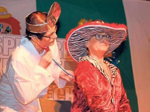 Die Tanzgruppe vom Sportverein Spexard, trainiert von Linda Uhr und Sophie Wittig, startete die Programmfolge. »Die Mäusetanzgruppe ist zu Tanzgirls herangewachsen«, kommentierte Moderatorin Katrin Westhoff im feschen Clown-Kostüm. Ein glänzendes Debüt in der Bütt gab Kerstin Krebs. Die Spexarderin findet es blöd, »dass wir heutzutage in einer Gesellschaft leben, in der der BMI (Body-Maß-Index) wichtiger ist als der IQ (Intelligenzquotient)«. Auch Tina Exner, schon viele Jahre als Tänzerin dabei, hatte einen großartigen ersten Solo-Auftritt: Live sang sie »Deine himmelblauen Augen« von Anna-Maria Zimmermann und den Beatrice-Egli-Song »Wir leben laut«. Vorher hatte sie ihr Lampenfieber mit einigen Schnäpschen gemildert. Früher gab’s die Schwarzwaldklinik, in Spexard gibt’s die Spexard-Klinik. Dr. Specht (Maria Kötter) behandelt nur besondere Fälle. Petra Stelter verkörperte die verschiedenen Patienten – alle konnten blitzartig geheilt werden. Frisch zurück »von Einkaufstour auf Kö«, glänzten Anja Kahlert und Karin Stüker als Tamara und Irina aus Russland. »Wir lieben nicht deutschen Mann, ist unromantisch«, gaben sie zum Besten. Die GroKo hat beschlossen: Jeder, der Geld verdient, muss zwei Rentner versorgen. Eine wunderbare Satire auf den Generationenvertrag gelang Karin Stüker als gut situierter Single mit den Rentnerinnen Anja Kahlert, Kerstin Krebs und der zur Hausgeburt geschickten Karin Drücker. Urgestein Helga Stöhr kam in diesem Jahr nicht aus dem Altersheim. Sie war mit Ehemann Egon auf Kreuzfahrt und gab in der Bütt pikante Details preis.