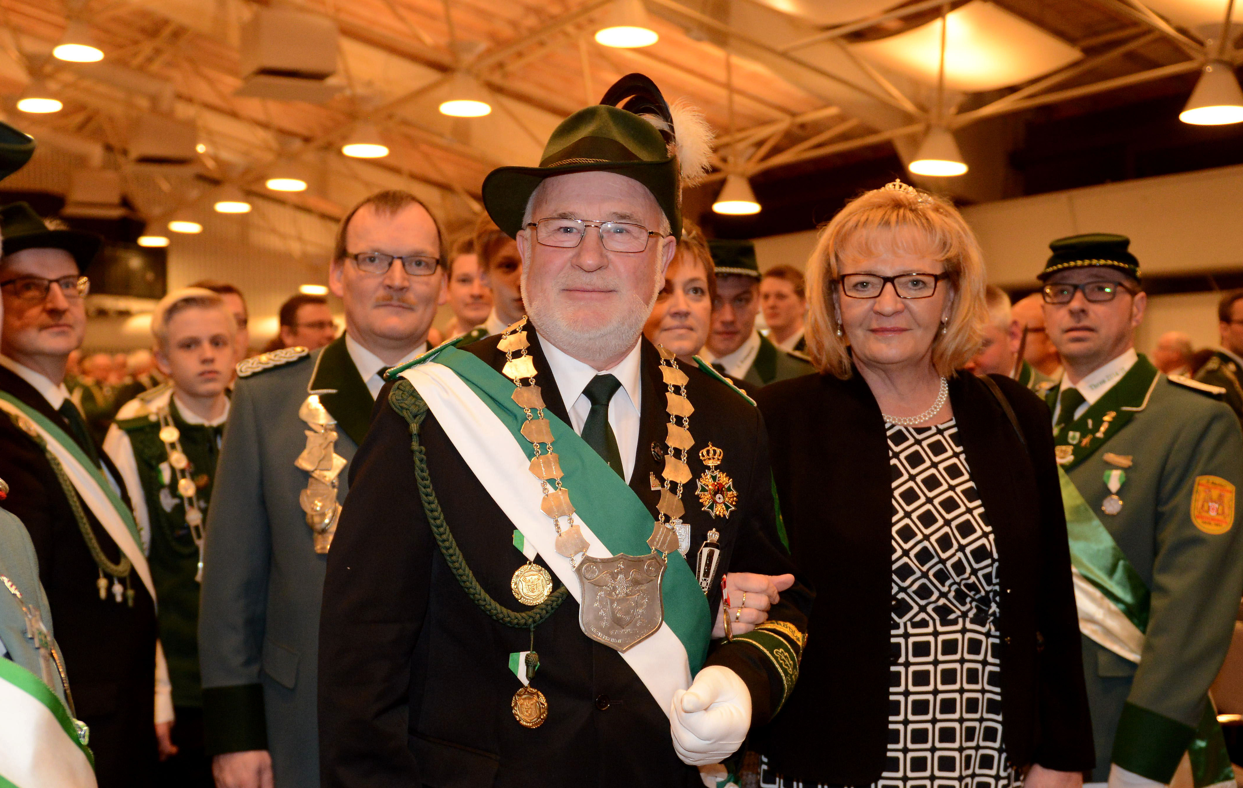| Das amtierende Bezirkskönigspaar Burkhard Willmann und Karola Cordfulland aus Spexard zog ins voll besetzte Wiedenbrücker Reethus ein. |