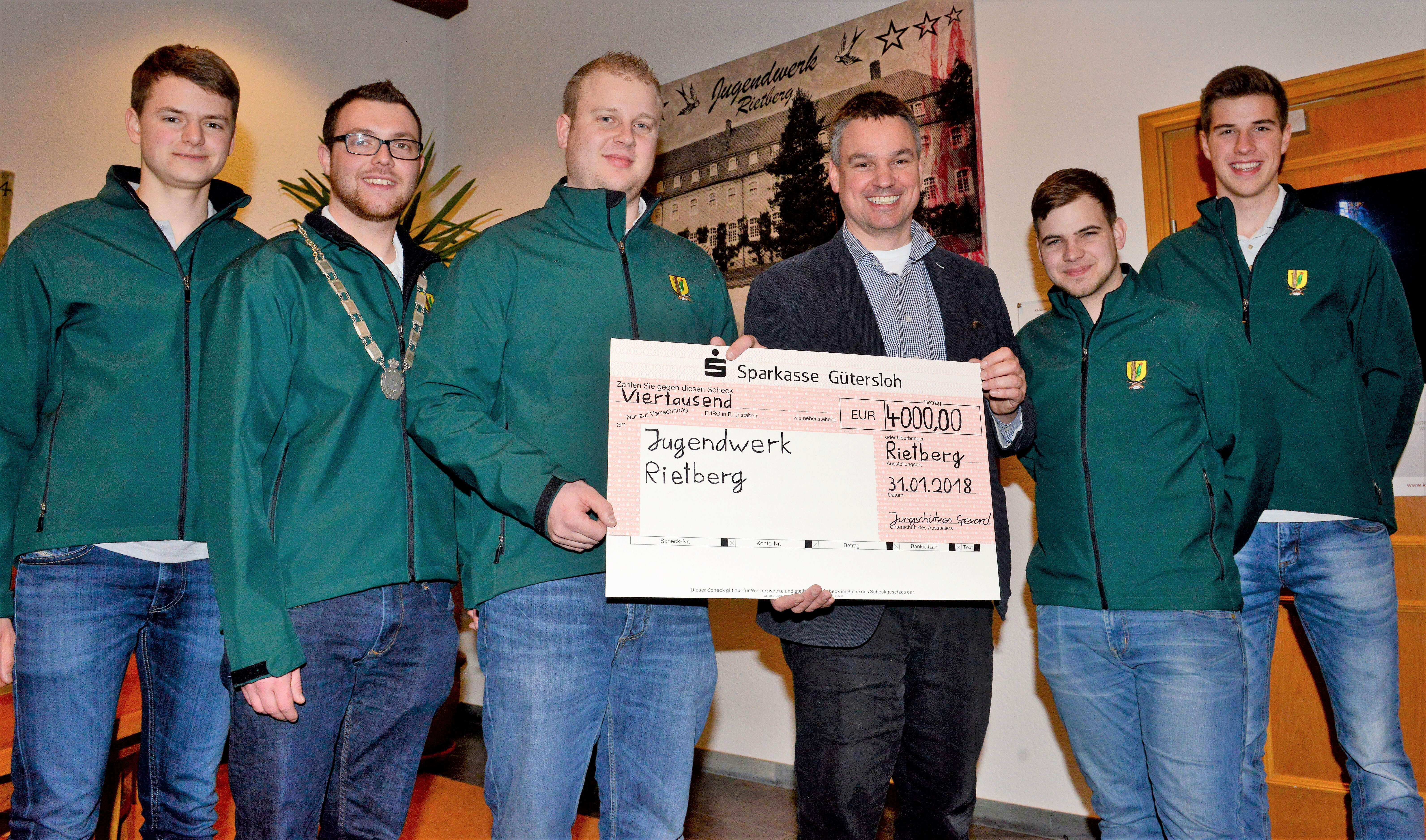 Die Jungschützen der St. Hubertus Schützenbruderschaft Spexard spenden 4.000 Euro aus dem Erlös der Tannenbaumsammelaktion für das Jugendwerk Rietberg. Der pädagogische Leiter Tobias Heimann nahm den Scheck entgegen und stellte den Jungschützen die Verwendung der Spende vor. Das Jugendwerk hat ein Haus für eine Wohngruppe erworben und wird die Zuwendung aus der Tannenbaumsammelaktion für die Gestaltung des Außengeländes nutzen. Mit über 60 Jungschützen hatten die Spexarder rund 1.000 ausgediente Tannenbäume eingesammelt. Seit 1995 wurden durch diese Aktion 45.000 Euro für karikative Zwecke im Kreis Gütersloh bereitgestellt.