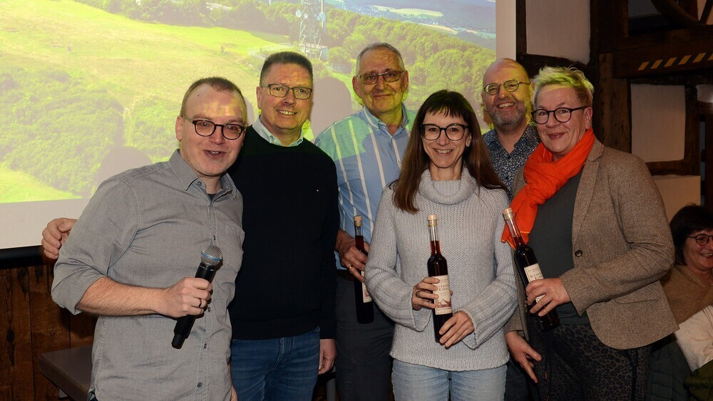 | Quizmaster Matthias Borner (v.l.), Christian Janzen vom Heimatverein und das Siegerteam Thorsten Beermann, Jutta Pflug, Martin Großerüschkamp und Anke Jonas. |