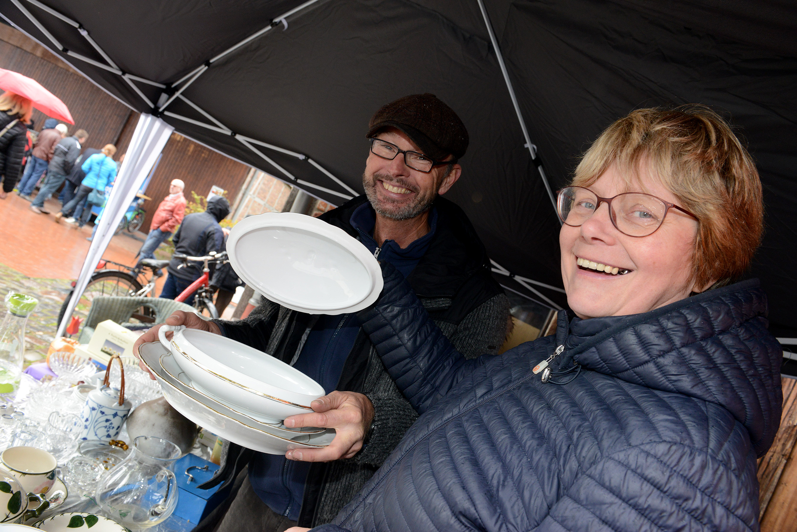 | Der Trödler Dirk Fortenbacher verkaufte Porzellan am Spexarder Bauernhaus und überzeugte Ingrid Hollenhorst. |