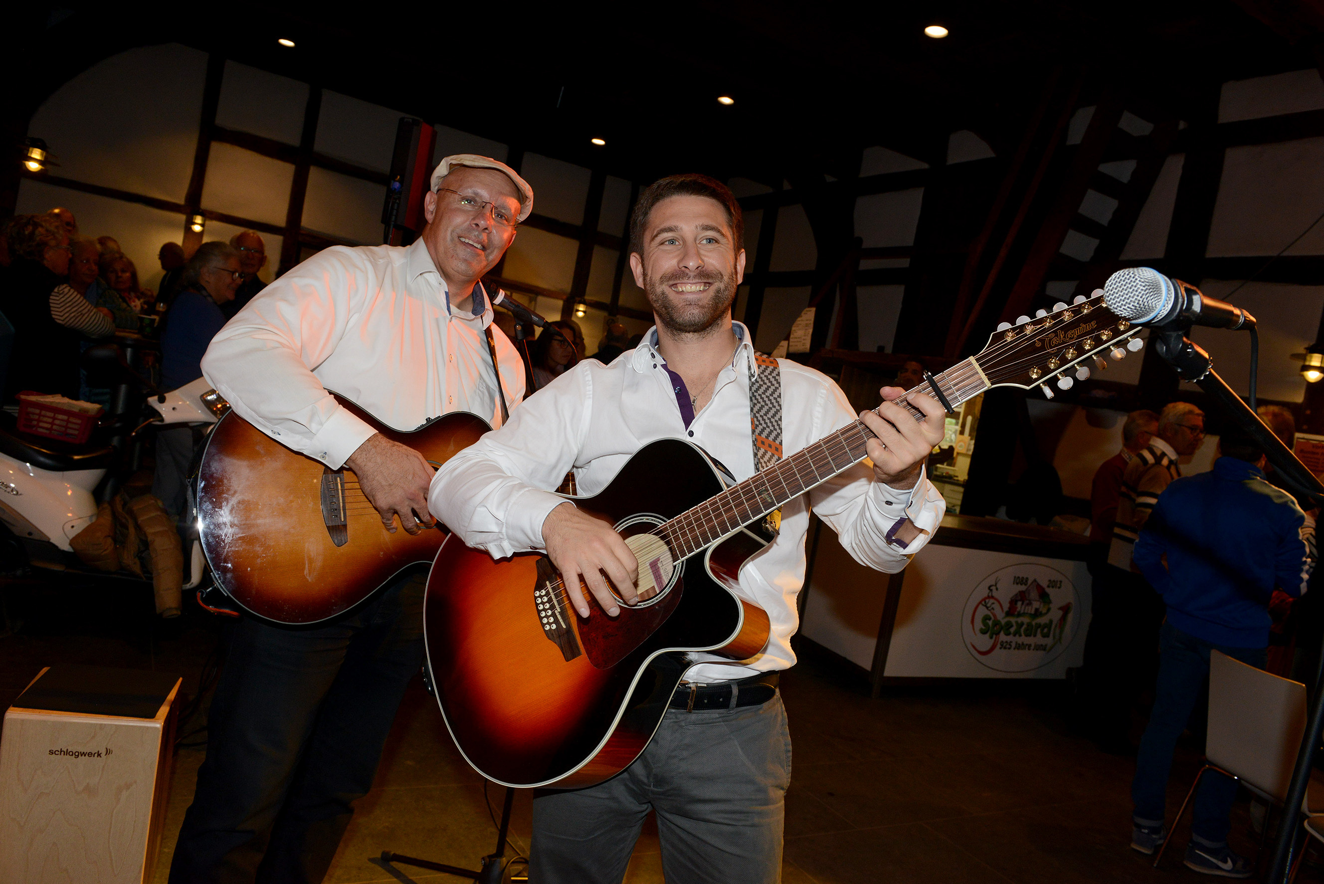 Der Arbeitskreis Musik hatte mit seinen fleißigen Helfern den Musikfrühschoppen auf der Deele des Bauernhauses durchgeführt. Das italienische Duo Ennio Cuccarano und Andrea Carbone präsentierte bekannte italienische Gassenhauer. Die Zuhörer im Spexarder Bauernhaus erlebten südländische Atmosphäre. Lieder wie "L’italiano", "Volare", "Marina" oder "Quando, quando" gehören zum Repertoire wie die Erfolgshits von Eros Ramazzotti oder Adriano Celentano. Die beiden Musiker Ennio und Andrea treten seit fünf Jahren fernab ihrer Heimat gemeinsam auf. Mit Gitarre, Mundharmonika und ihrem Gesang setzen die Vollblutmusiker Gefühle frei und animieren die Besucher zum Mitsingen. „Ich lebe seit sechs Jahren in Deutschland und die Musik ist unsere große Passion“, sagt Andrea Carbone, der mit dem Gütersloher Ennio Cuccarone den regnerischen Feiertag in Ostwestfalen vergessen machte. Mit dem Fahrrad war Bürgermeister Henning Schulz nach Spexard geradelt und trat mit Baudezernentin Nina Herrling und den Spexarder Bürgern in den Dialog.