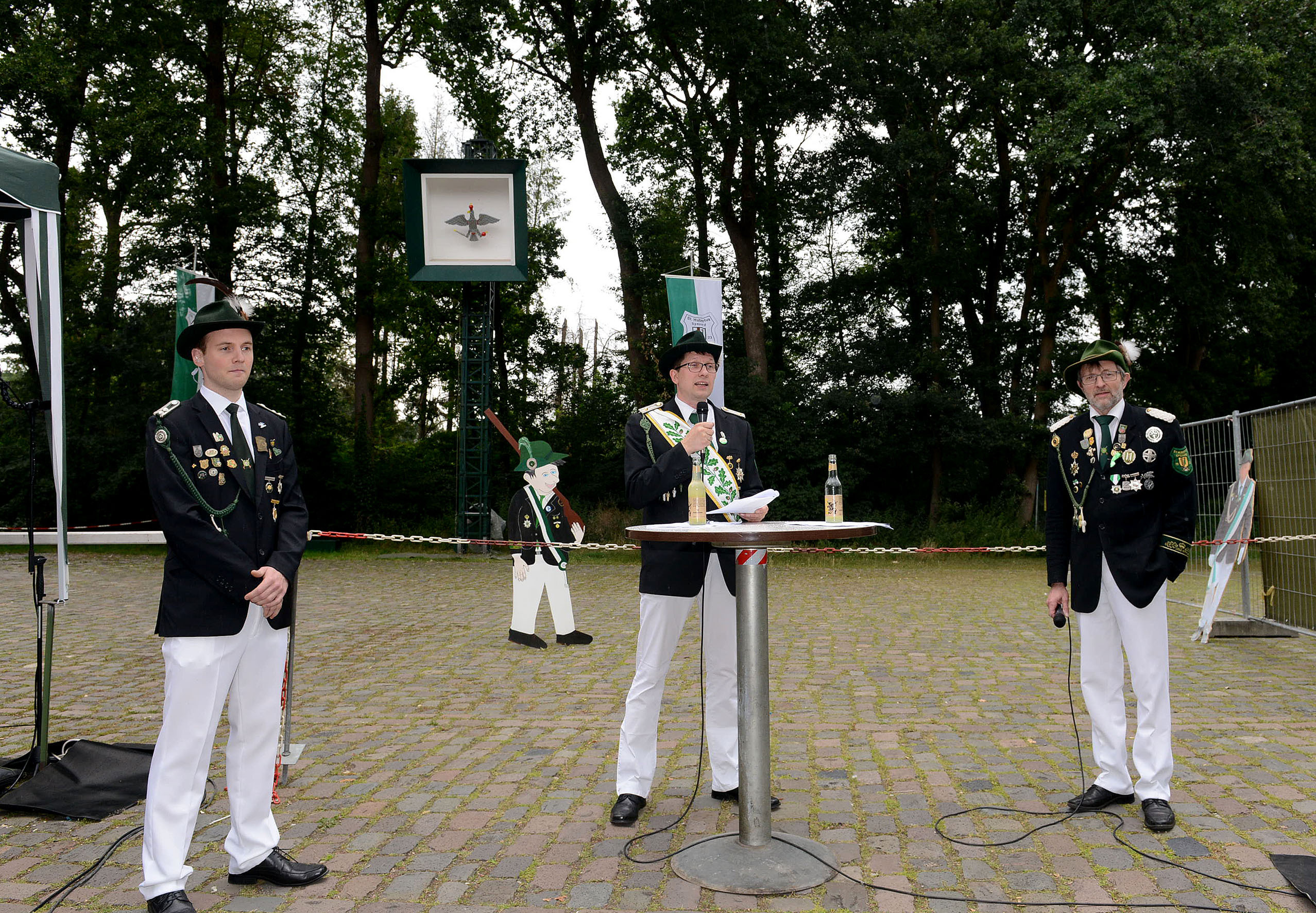 Nach dem tollen Auftakt an der Bruder-Konrad-Kirche am Freitag gingen die umfangreichen Onlineaktivitäten auf den vom Technikteam um Moritz Toppmöller, Niklas Reimer und Michael Steinkamp eingerichteten Plattformen weiter. Höhepunkt war am Samstag die Ermittlung des Online-Schützenkönigs und die Übertragung des Live-Streams aus dem Übertragungswagen am Bauernhaus. In der Spitze verfolgten mehr als 1.500 Menschen das Vogelschießen online. Es war das bislang erste Vogelschießen überhaupt im Bezirksverband Wiedenbrück und im Kreis Gütersloh. Vielleicht war es auch das erste in Nordrhein-Westfalen oder sogar in Deutschland. Über 200 Mitglieder wollten als Online-König in die Geschichte eingehen. Das unter Ausschluss der Öffentlichkeit von den Schießmeistern Alexander Hark, Nick Melzer und Rene Stükerjürgen durchgeführte Vogelschießen begann um 17 Uhr. Die Moderation lag in den Händen von Johannes Hollenhorst und Simon Hecker.