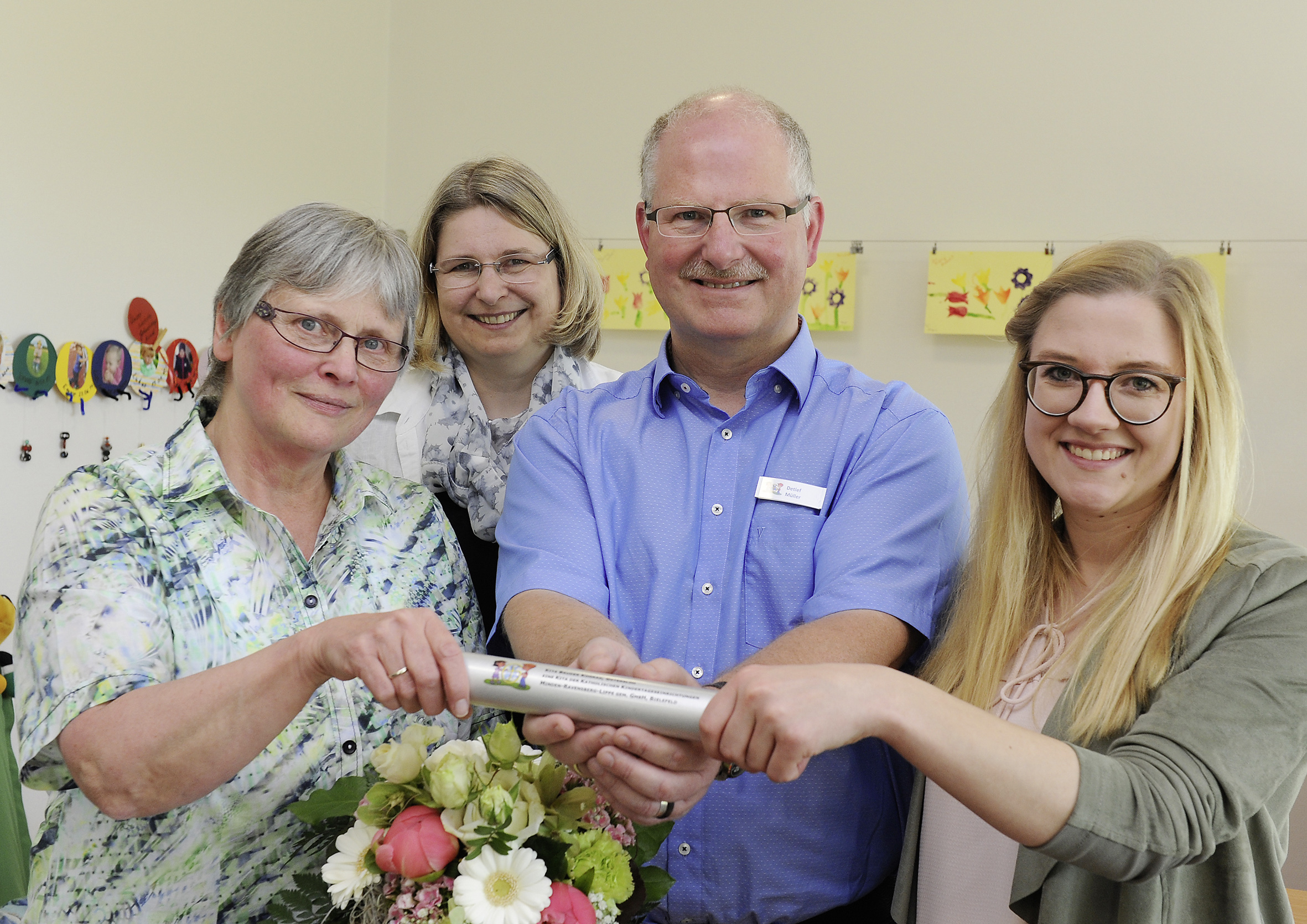 „Sie wollten nie im Mittelpunkt stehen, aber heute geht das nicht anders“ ging Detlef Müller, der Geschäftsführer des Trägers, der Kath. Kindertageseinrichtungen Minden-Ravensberg-Lippe gem. GmbH in Bielefeld, in seiner Würdigung auf eine weitere Eigenschaft der scheidenden Leiterin ein: „Die Kinder und das Team standen immer im Vordergrund, nicht zuletzt deshalb ist diese Einrichtung heute absolut auf der Höhe der Zeit.“ Aktuell besuchen 74 Kinder in vier Gruppen den Kindergarten in Spexard. Eine ganze Reihe von Umbaumaßnahmen sorgte dafür, dass sie heute optimale räumliche und pädagogische Bedingungen vorfinden. Ein Punkt, den Barbara Pröger in ihren Abschiedsworten besonders hervorhob: „Ich glaube, wir alle – ob Kinder, Eltern oder Mitarbeiterinnen – haben uns hier immer gut aufgehoben gefühlt! Es gab von Seiten des Trägers viele Gestaltungsmöglichkeiten, diese haben wir alle gemeinsam genutzt!“ Einen „Staffelstab“ übergab die scheidende Leiterin schließlich symbolisch an ihre Nachfolgerin Carina Hollenhorst. Sie übernehme damit zwar viel Verantwortung, machte Detlef Müller deutlich, der Stab stehe aber auch dafür, dass „man nie allein unterwegs sei“, sondern viele Begleiter und Unterstützer auf seinem Weg habe.