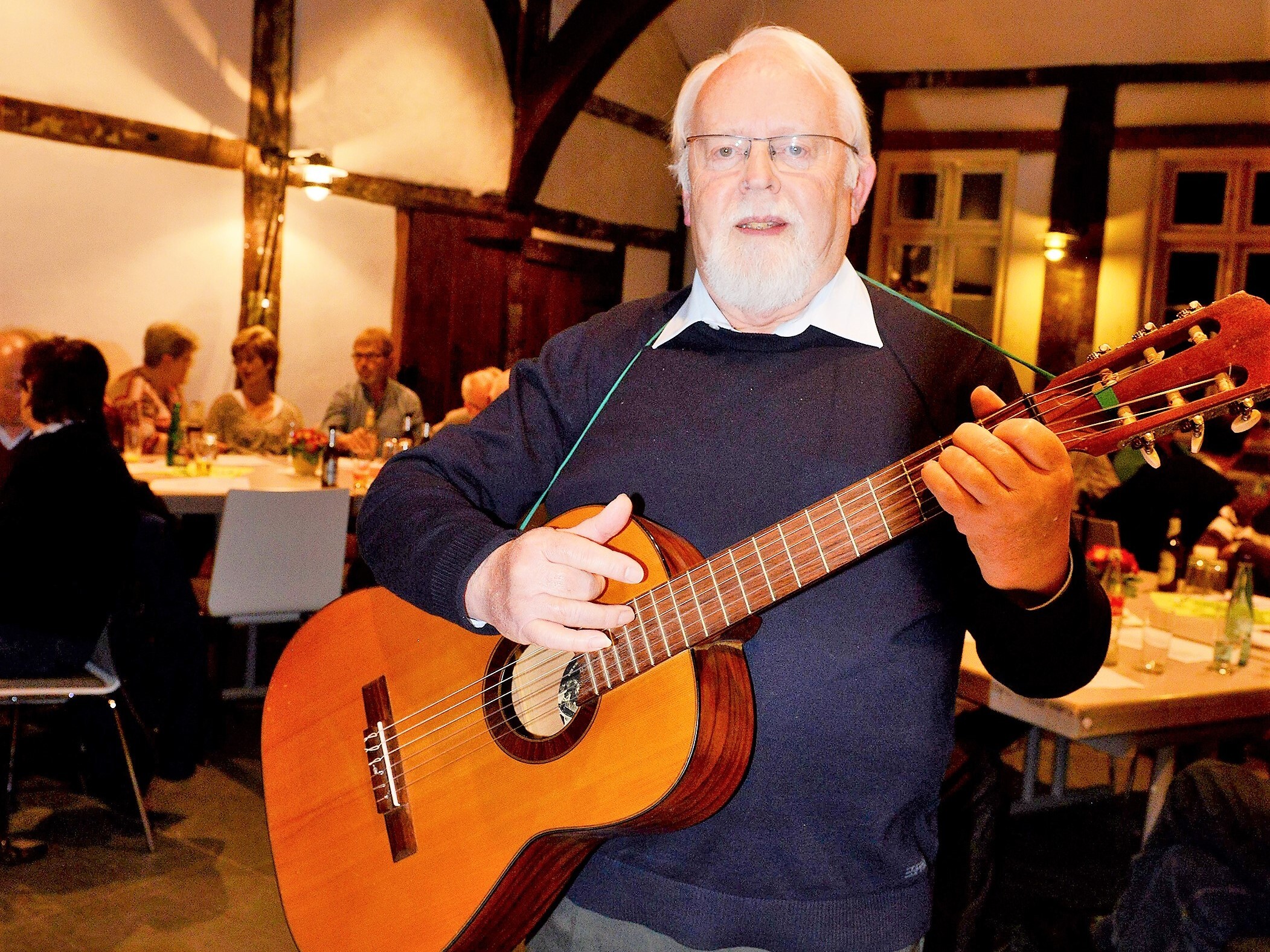 Aber nicht nur Heiteres von Ludwig Grabemann wurde wieder lebendig, auch Geschichten aus der eigenen Feder von Franz Thiesbrummel trugen zu heiteren Stunden bei. Plattdeutsches aus dem Münsterland und dem benachbarten Brockhagen hatte Thiesbrummel in das heimische Platt übersetzt. Keine einfache Arbeit, weil von Ortschaft zu Ortschaft die Vielfalt der Aussprache unterschiedlich ist. Der Avenwedder Thiesbrummel – seine Großmutter war eine geborene Müterthies aus Spexard – fühlte sich in Spexard recht wohl und zum Abschluss wurde es musikalisch. Die Zuhörer sangen und schunkelten im Fleet des historischen Fachwerkhauses. Das beliebte Volkslied „wenn alle Brünnlein fließen“, natürlich in Plattdeutsch („wenn alle Pütts vull Water sind“) von Thiesbrummel gespielt, wurde vom Liederzettel mitgesungen. Die älteren Besucher konnten sich noch an das längst vergessene Mandolinenorchester „Früh auf Spexard“ erinnern, bei dem Franz Thiesbrummel einst die Liebe zur Musik fand.