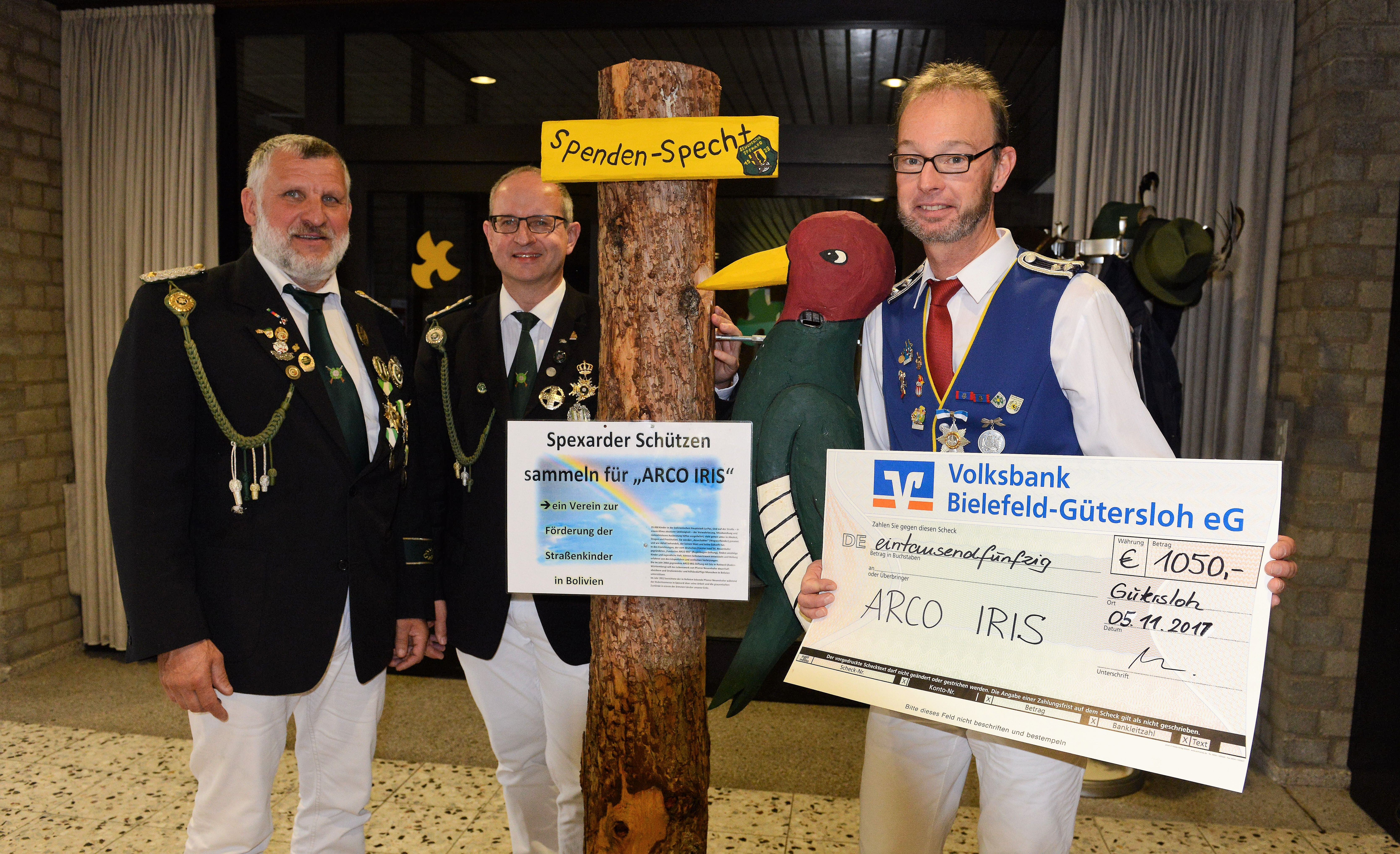 Die Schützenbruderschaft St. Hubertus Spexard hat 1050 Euro für die Betreuung von Straßenkindern in Bolivien gespendet. Die Schützen unterstützen das Familienprojekt „Arco Iris“ (zu Deutsch „Stiftung Regenbogen“) in der bolivianischen Hauptstadt La Paz. Das soziale Werk des deutschen Pfarrers Josef Maria Neuenhofer kümmert sich seit 1994 um die Bedürfnisse von Straßenkindern und Familien. Mit der gespendeten Summe werden drei Familien ein Jahr lang unterstützt. Die Aktion der Hubertusschützen soll in den kommenden Jahren fortgesetzt werden. Der Erlös vom Verkauf von Getränken und Speisen nach der Fronleichnamsprozession fließt in den Spendentopf wie auch der jährliche Trödelmarkt der Schützen, der durch den Einsatz von Dirk Fortenbacher unterstützt wird. Am 3. Oktober trödelten die Schützen am Spexarder Bauernhaus. „Wir führen ein ziemlich privilegiertes Leben und brechen und keinen Zacken aus der Krone wenn wir für diejenigen Spenden, die es nicht so gut getroffen haben auf dieser Erde“, sagte Friedhelm Stüker, der Sprecher der Spexarder Spendenaktion.