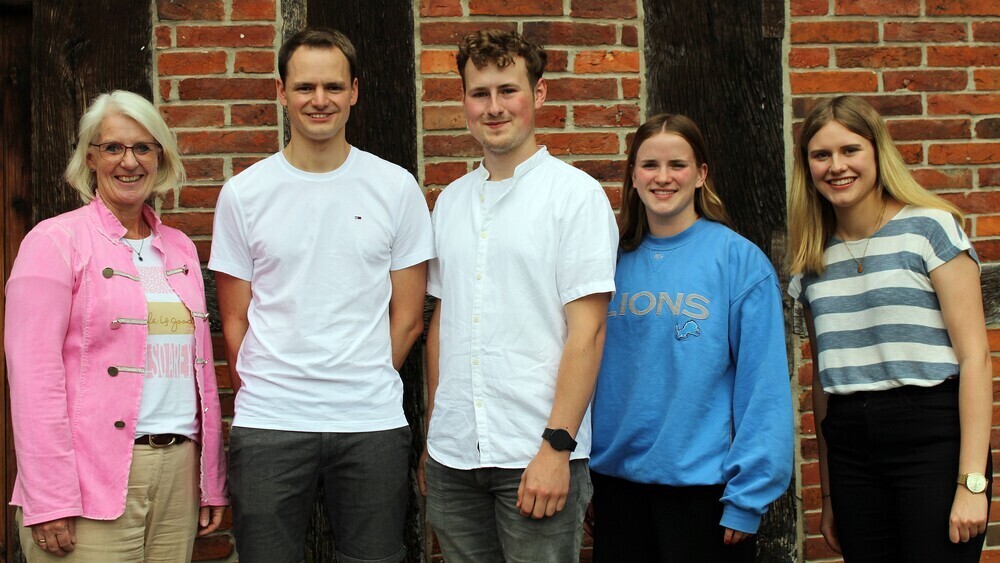 Zur Spendenübergabe trafen sich am Spexarder Bauernhaus (v. l.): Claudia Holle (Geschäftsführerin der Osthushenrich-Stiftung), sowie Steffen Thiesbrummel, Cai Nolding, Lisa Morre und Madlen Wu